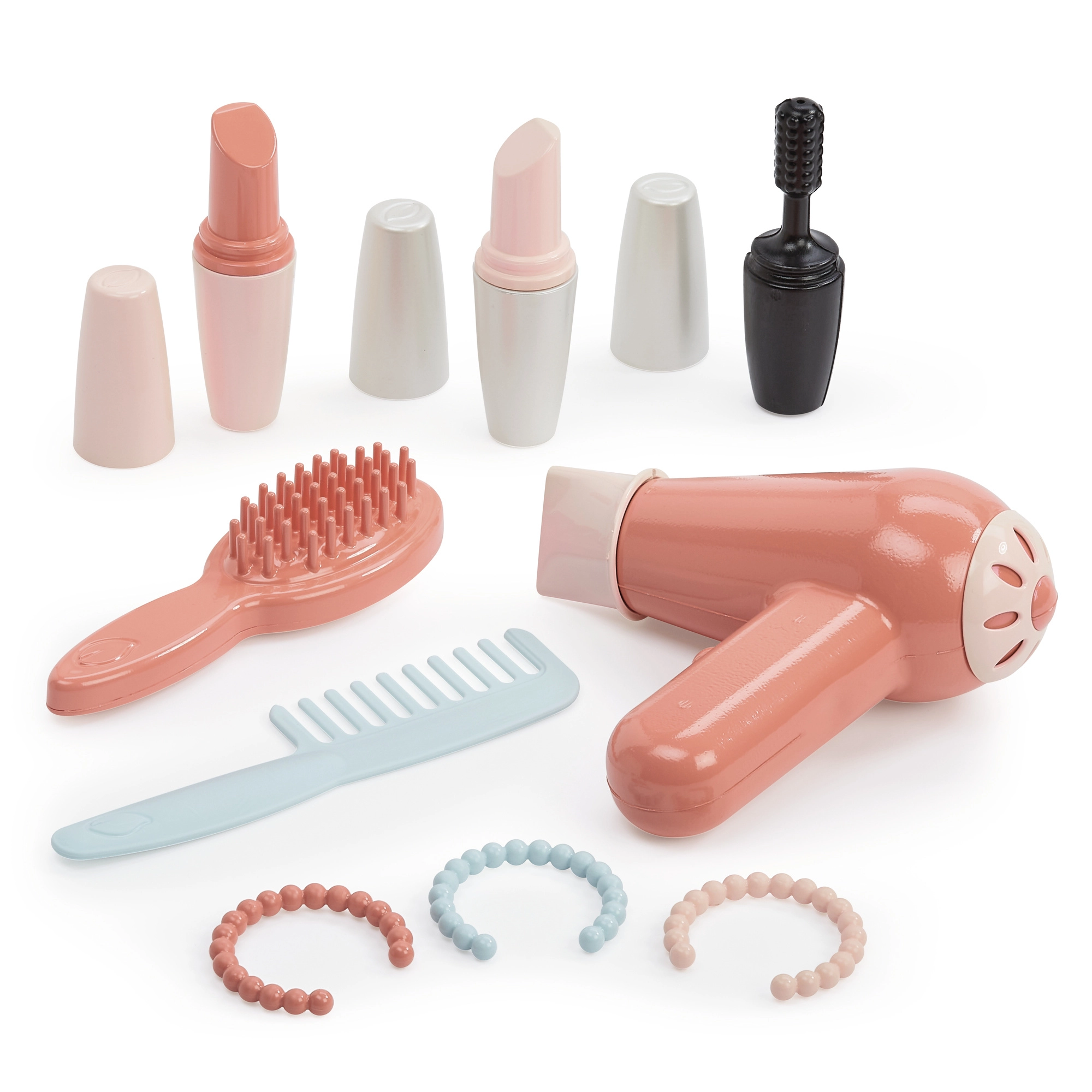 Include pieptene, perie, uscător de păr pentru copii, „rujuri”, „rimel”, paletă și brățări – ideal pentru jocul imaginativ de salon de frumusețe.