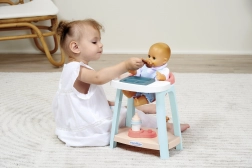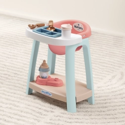 Acest set adorabil pentru hrănirea păpușilor le oferă copiilor tot ce au nevoie pentru a imita îngrijirea unui bebeluș. Scăunelul pentru păpuși cu picioare stabile și tăviță compartimentată, sticluța, paharul cu tetină și lingurițele creează un mediu distractiv și stimulant pentru dezvoltarea empatiei, a motricității fine și a jocului creativ.