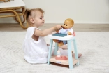 Scaunul înalt, stabil, cu tăviță le permite copiilor să „hrănească” confortabil păpușa și să imite ritualurile reale de la masă.