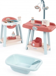 Setul include o zonă de schimbat cu compartimente de depozitare, o cădiță compactă bleu cu oliță și un scaun înalt stabil cu tavă detașabilă pentru hrănire. Sunt incluse și accesorii precum sticluță, boluri și tacâmuri, pieptene și „scutece”. Totul este potrivit pentru păpuși de aproximativ 32 cm.