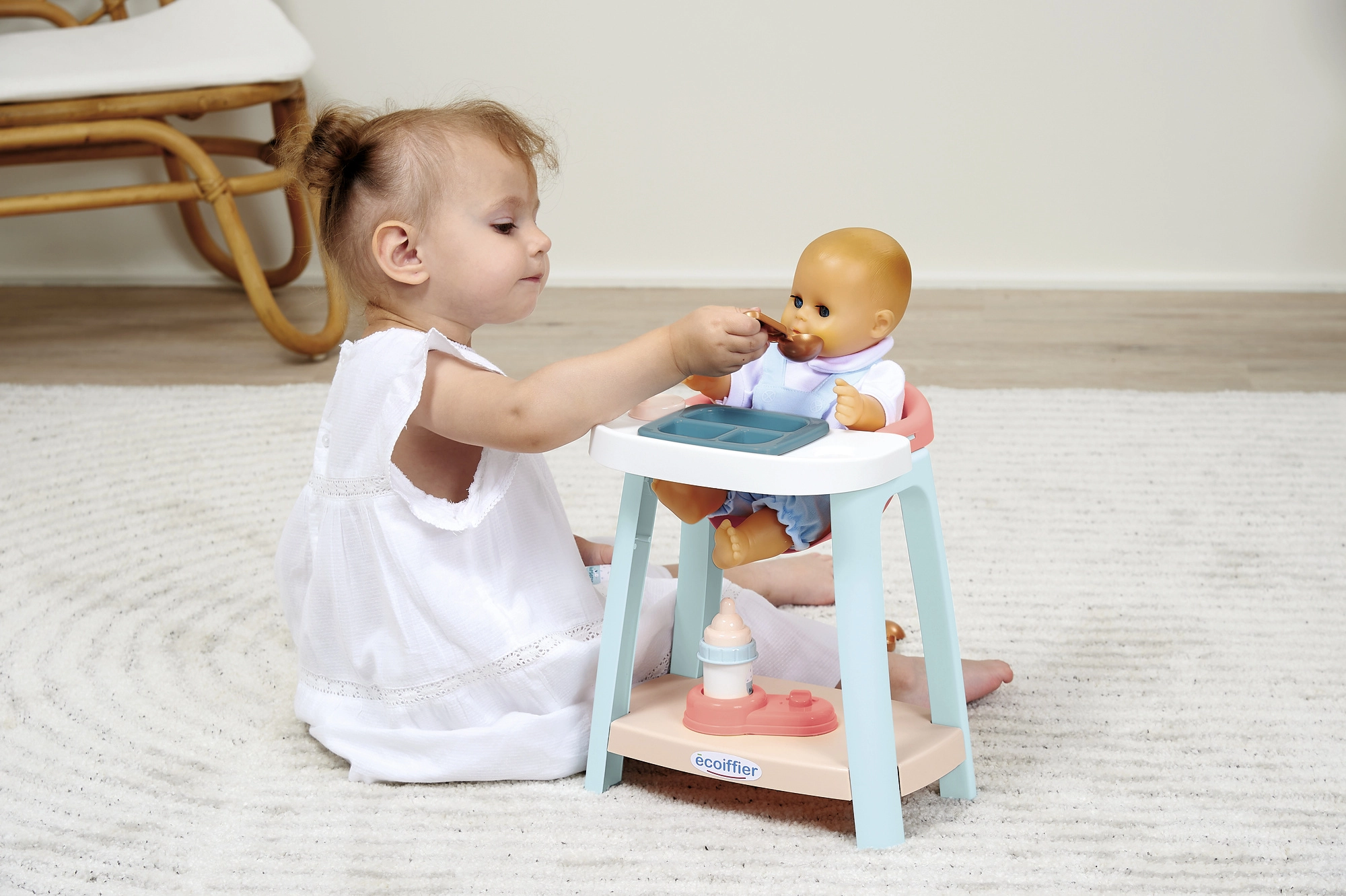 Scaun înalt stabil cu farfurie compartimentată, ceașcă și tacâmuri, le permite copiilor să „hrănească” păpușa realist. Marginile rotunjite și construcția solidă susțin jocul în siguranță.