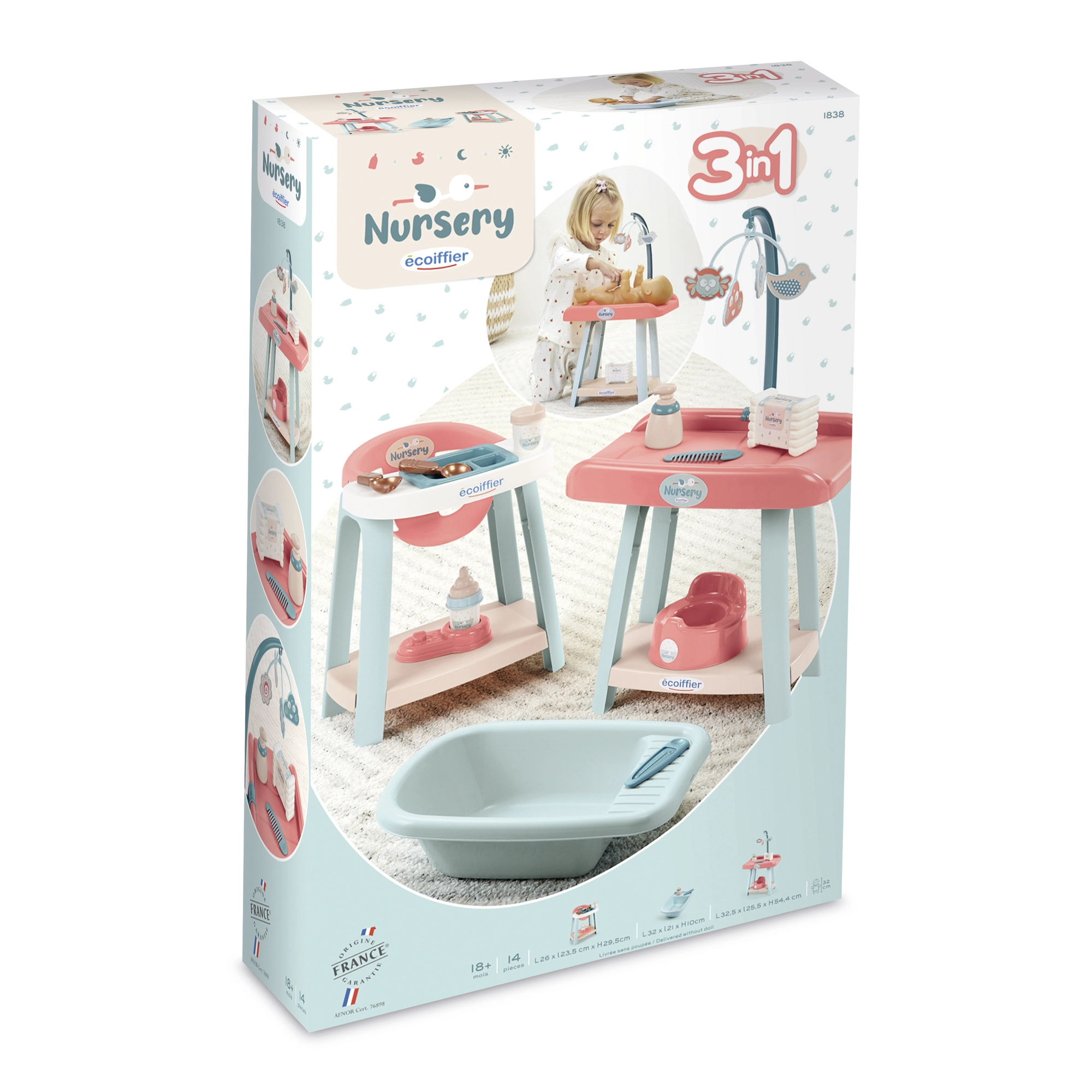 Ecoiffier Nursery 3în1 este un set versatil pentru îngrijirea păpușilor, care oferă totul de la hrănire și schimbat până la baie. Datorită celor trei zone de joacă și accesoriilor numeroase, copiii pot imita îngrijirea zilnică a unui bebeluș și își pot crea propriile povești. Culorile pastelate și formele rotunjite asigură un aspect plăcut și o utilizare sigură.
