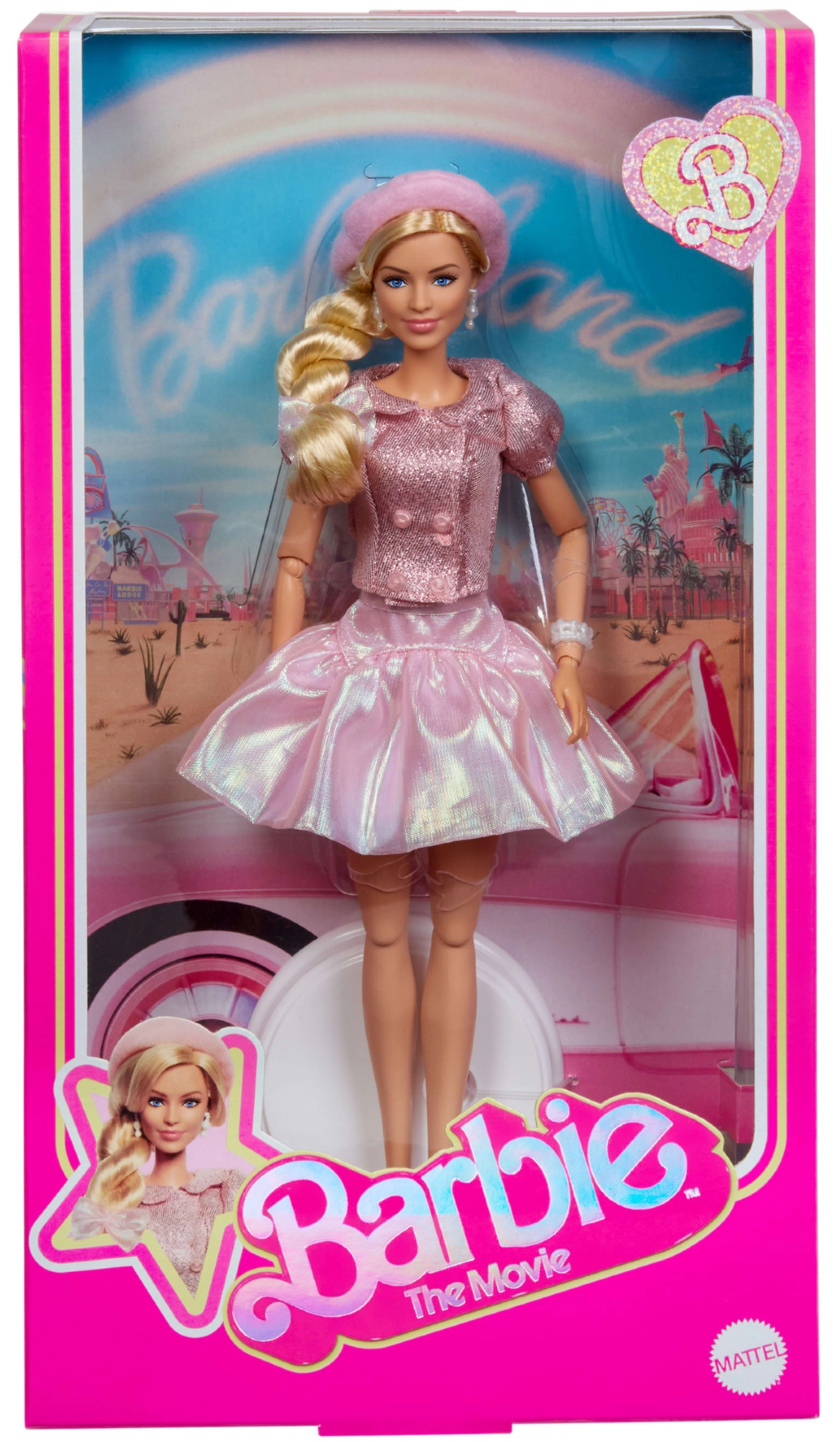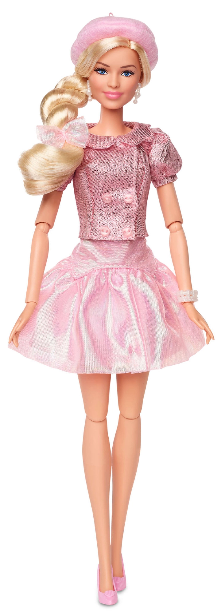 Această păpușă BARBIE stilată aduce un look cinematografic iconic în nuanțe delicate de roz. Rochia sclipitoare cu mâneci bufante, bereta roz și accesoriile asortate formează o ținută perfect armonizată, care se evidențiază în orice colecție sau cameră de copil. Construcția articulată permite schimbarea ușoară a pozițiilor și crearea de scene din film sau povești proprii.