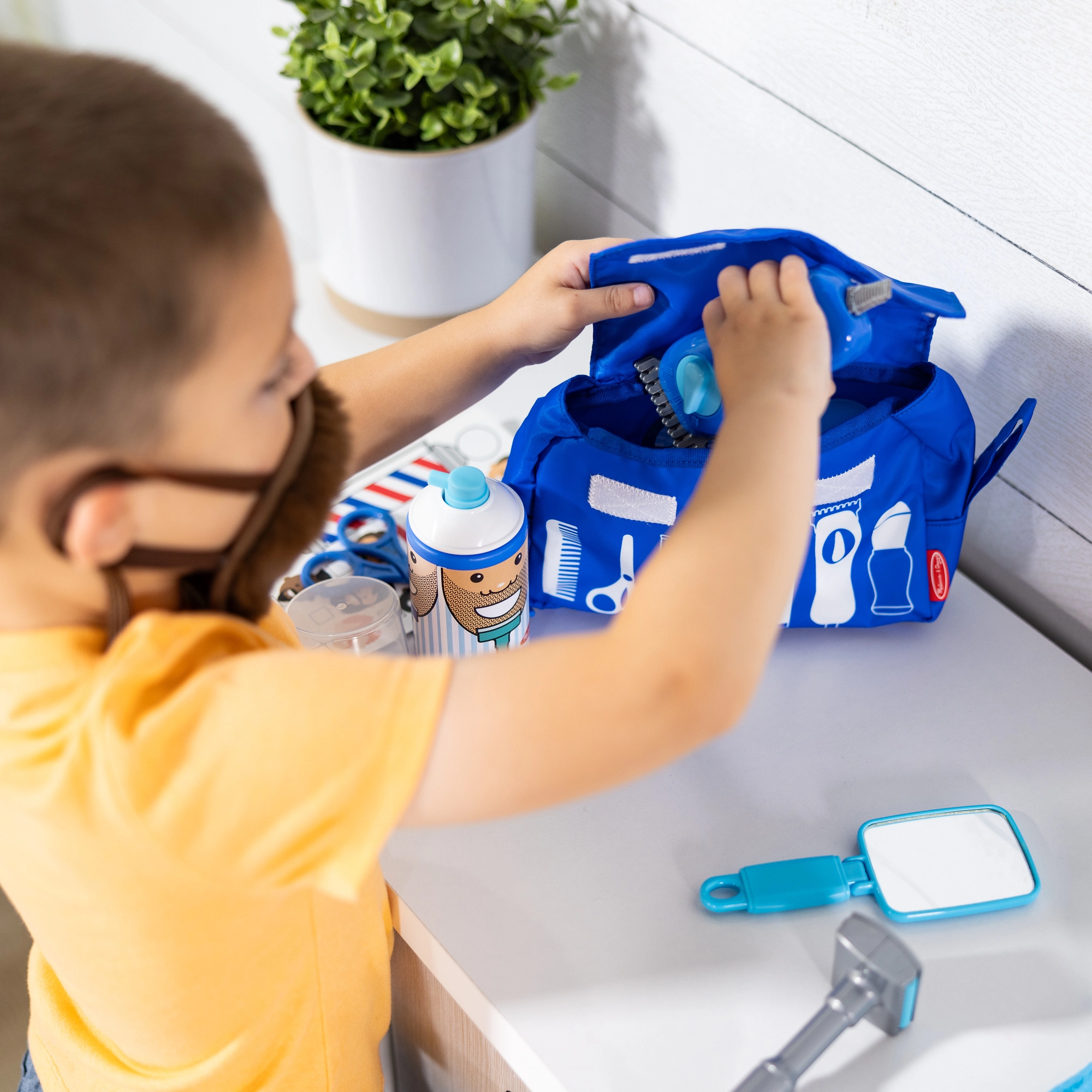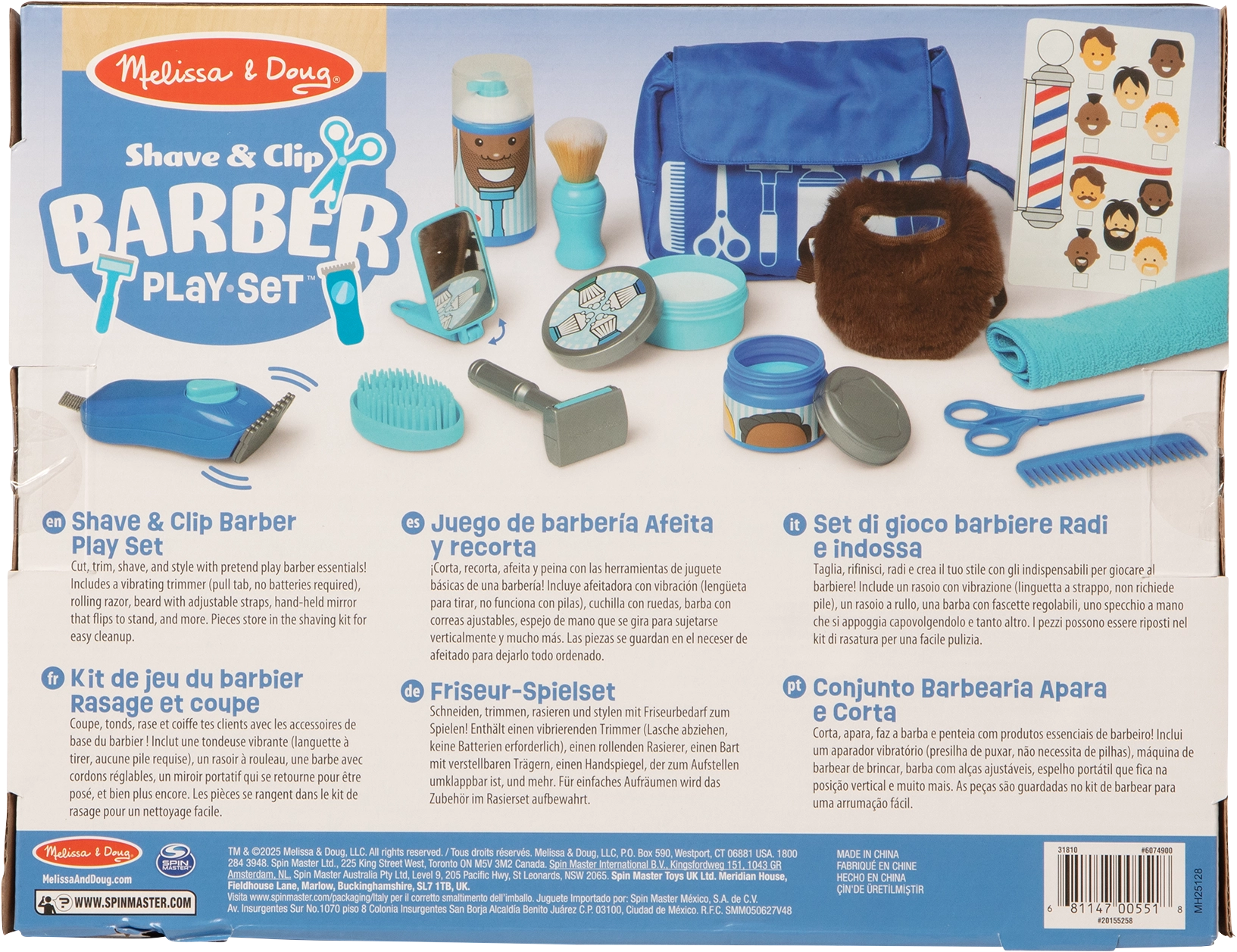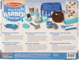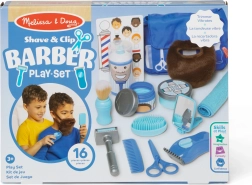 Aparat de tuns, foarfecă, pieptăn, pensulă de bărbierit, spumă și oglindă permit imitarea fidelă a procedurilor reale din salon.