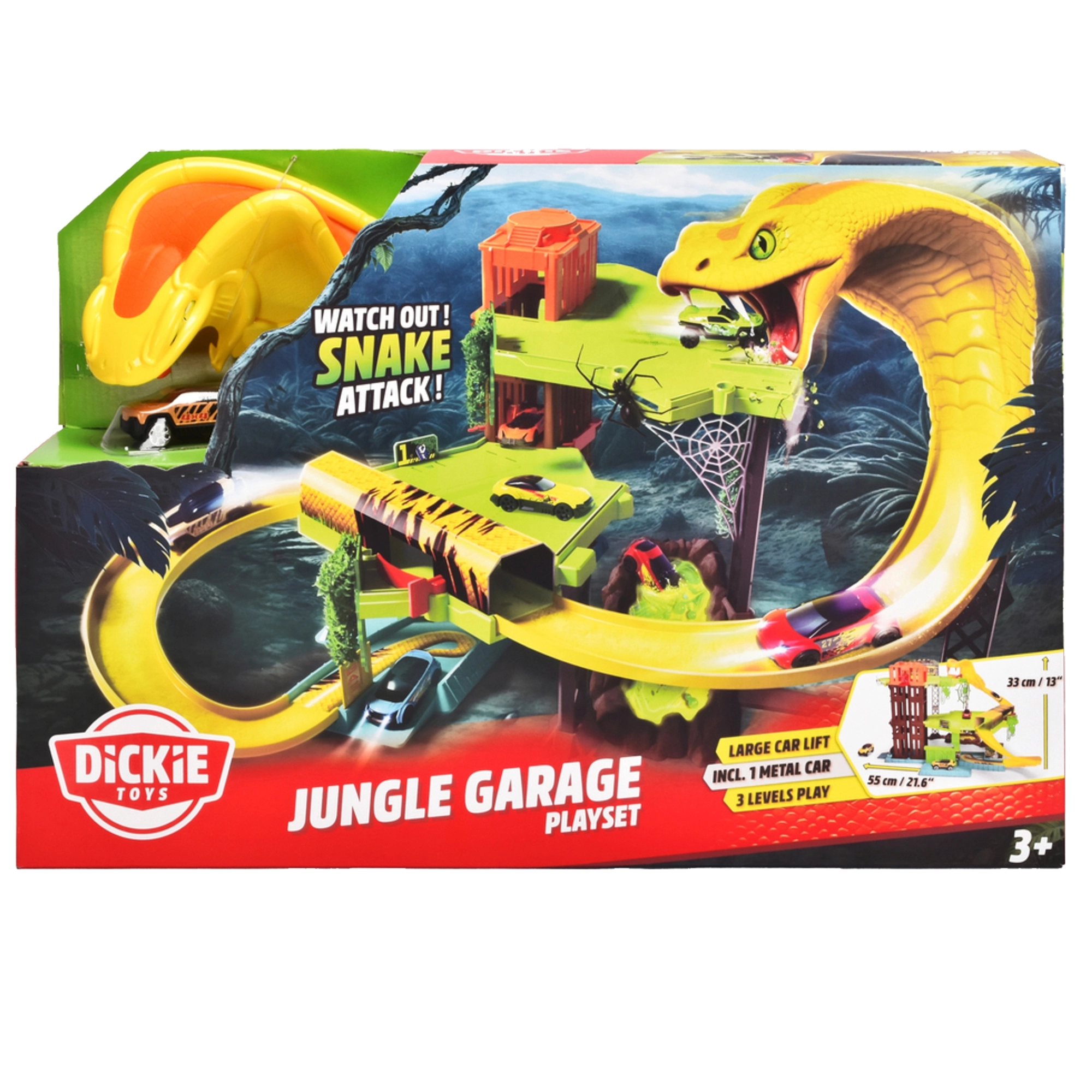 Pornește într-o cursă palpitantă prin junglă și explorează toate cele trei niveluri ale pistei, unde te pândește un șarpe uriaș. Pista de curse Dickie Toys este concepută pentru joacă dinamică, cu coborâri și urcări fluide, iar datorită liftului mobil poți muta ușor mașinuța între etaje.