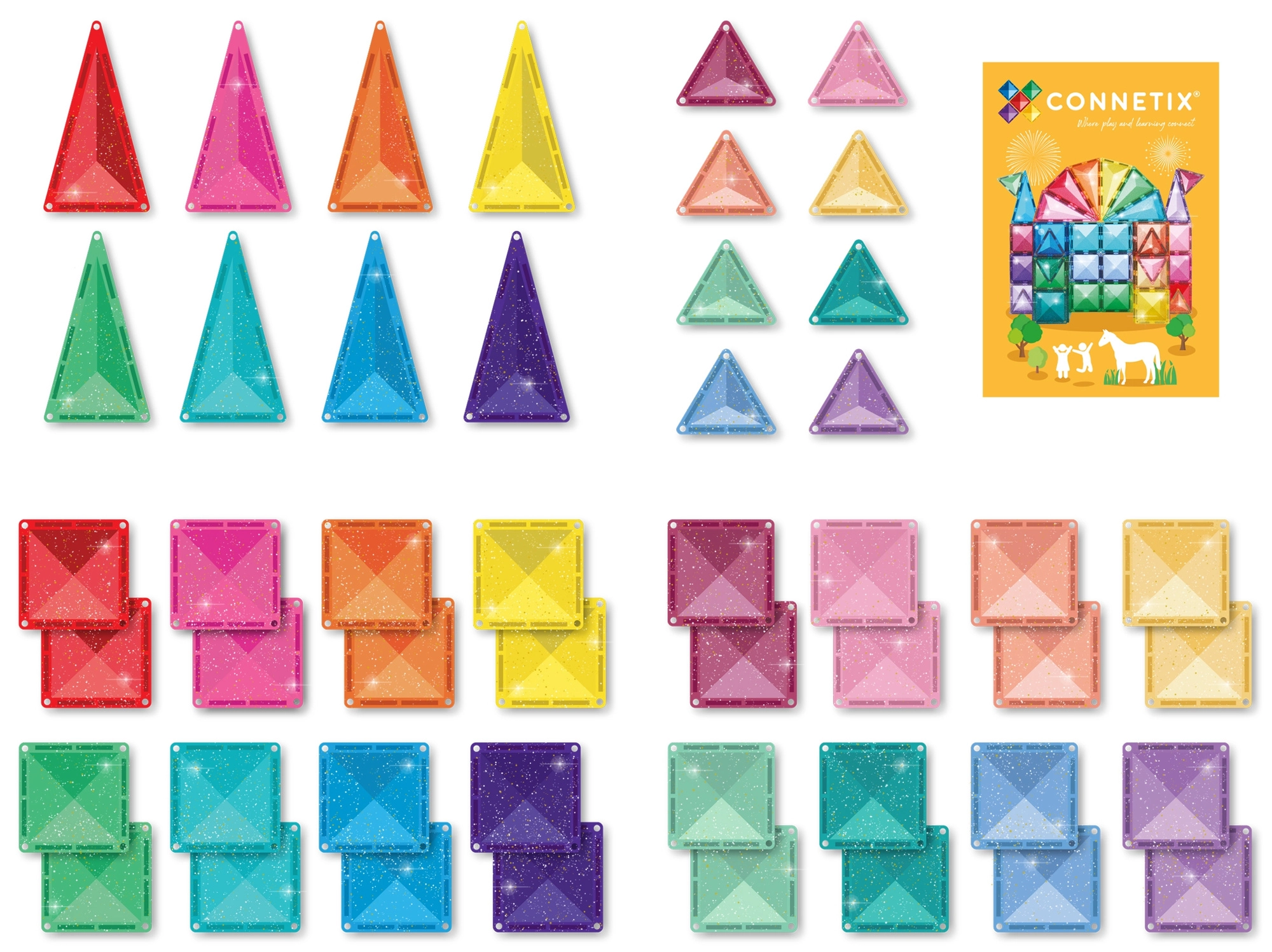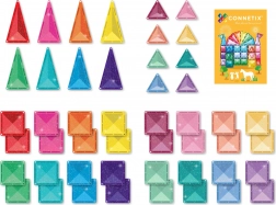 Setul de 48 de piese, cu pătrate și triunghiuri, completat de o broșură ilustrată, este compatibil cu alte seturi CONNETIX pentru proiecte fără sfârșit.