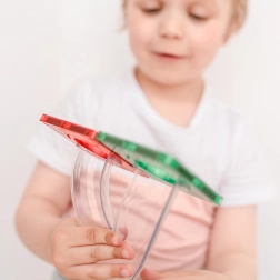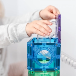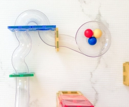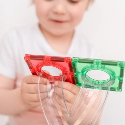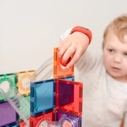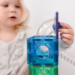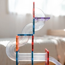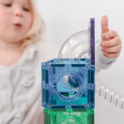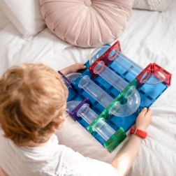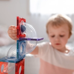 Construiește turnuri colorate, poduri și piste elaborate pentru bile, urmărește parcursul bilelor prin tunelurile transparente și descoperă principiile gravitației, vitezei și echilibrului. Plăcile Connetix în culori curcubeu au magneți nituți ferm, care se atrag din toate părțile, astfel încât structurile sunt stabile, iar „clicul” la îmbinare este extrem de satisfăcător.