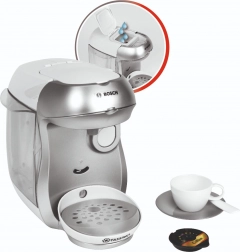 Cafetiera pentru copii TASSIMO BOSCH, în variantă alb-argintie, reproduce fidel un aparat real, dar este complet sigură pentru cei mici. Este suficient să turnați apă în rezervor, să introduceți capsula sub capacul superior și să apăsați butonul mare start/stop – cafetiera pornește debitul de apă și adaugă sunete autentice pentru o experiență de joc și mai realistă.
