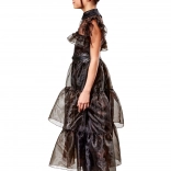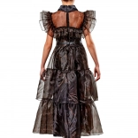 Rochie lungă neagră cu fustă în straturi, guler înalt și volane translucide creează atmosfera autentică a eroinei îndrăgite.