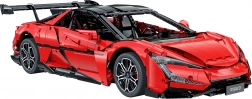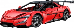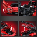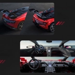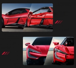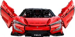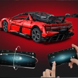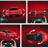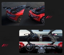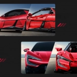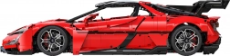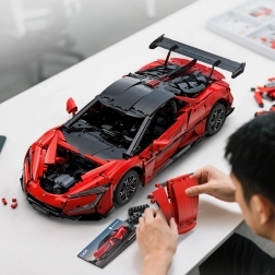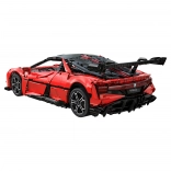 Caroserie roșie fidel redată, cu detalii imprimate, jante sportive și aripă aerodinamică. Dimensiunile asamblate aprox. 60,5 × 29,5 × 16 cm ies în evidență în orice colecție.