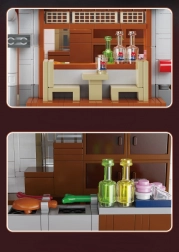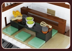 La parter te așteaptă o încăpere primitoare cu tejghea și grătar, iar la etaj un salon intim pentru ceai. Ușile glisante și accesoriile bogate (mâncare, set de ceai) transformă modelul într-o piesă excelentă de expus și într-un proiect distractiv pentru constructori de la 14 ani în sus. Luminiile LED cu efecte subliniază atmosfera și, seara, modelul prinde literalmente viață.