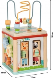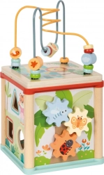 Cubul motoric multifuncțional din lemn certificat FSC oferă copiilor de la 12 luni numeroase posibilități de joacă și învățare. Include labirint cu mărgele, sortator de forme, roți dințate, șine glisante și cuburi rotative cu animăluțe. Designul compact, cu capac detașabil ce poate fi depozitat în interior, economisește spațiu, dezvoltă motricitatea fină, coordonarea mână–ochi, percepția formelor și culorilor și stimulează creativitatea copiilor.