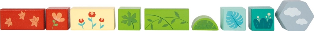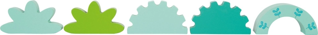 Setul include cuburi, cilindri, arcade și piese imprimate în culori naturale și pastel, care stimulează imaginația și gândirea spațială.