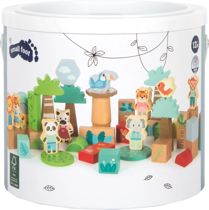 Acest set fermecător aduce în camera copiilor lumea junglei plină de animăluțe și scene inventive. Vei găsi cuburi de forme și dimensiuni variate, piese imprimate cu frunze și plante, precum și figurine îndrăgite precum tigru, panda, maimuțică și păsărele. Copiii pot construi turnuri, poduri și întregi peisaje, dezvoltându-și imaginația și creând propriile povești.