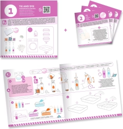 Setul include vopsele, accesorii și instrucțiuni clare – deschizi și începi să creezi piese tie-dye unice.