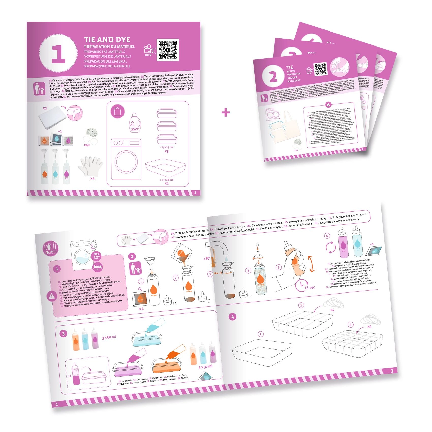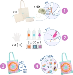 Acest set DIY complet pentru tie-dye transformă accesoriile textile obișnuite în piese originale și stilate. Datorită instrucțiunilor clare, pas cu pas, tehnicile de legare și vopsire sunt accesibile și copiilor sau începătorilor. Creează spirale, dungi, inimioare sau efecte marmorate și exprimă-ți creativitatea.