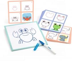 Set creativ distractiv pentru copii, datorită căruia învață să deseneze pas cu pas adorabili pui de animale. Șabloanele ghidează fiecare mișcare, iar markerul lavabil permite încercări repetate, dezvoltând motricitatea fină și creativitatea.