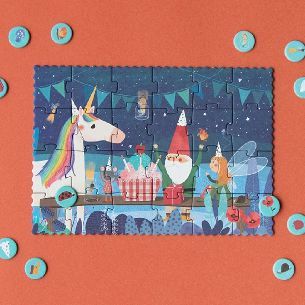Descoperă lumea fermecată a petrecerii de seară a unicornului cu puzzle-ul de buzunar de la LONDJI. Datorită formatului compact, încape în buzunar sau în rucsac și îi distrează de minune pe copii la cafenea, în tren sau în vizită.