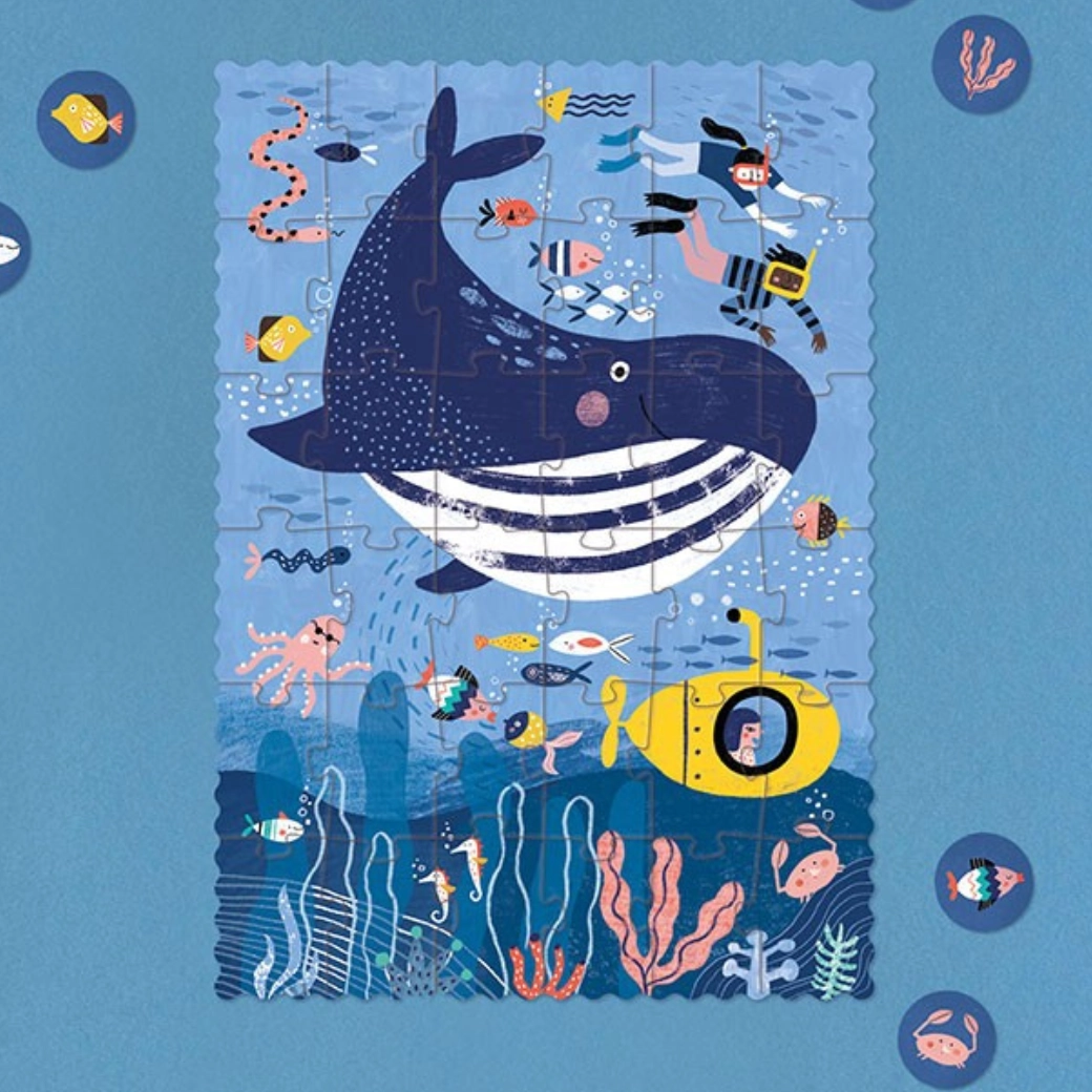 Descoperă farmecul oceanului cu puzzle-ul de buzunar Londji Marea. Această mini-îmbinare compactă cu 36 de piese este ideală pentru călătorii și pentru ghiozdanul copiilor. Cei mici vor întâlni balena albastră și alți locuitori ai mării, dezvoltând răbdarea, logica și motricitatea fină.
