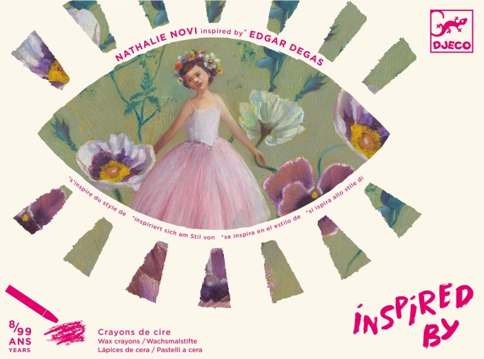 Setul Djeco Inspired by Degas aduce copiilor poezia impresionismului prin motive ale dansului și mișcării. Datorită suporturilor pretipărite și pașilor intuitivi, copiii obțin cu ușurință rezultate de impact și se bucură de procesul de creație.