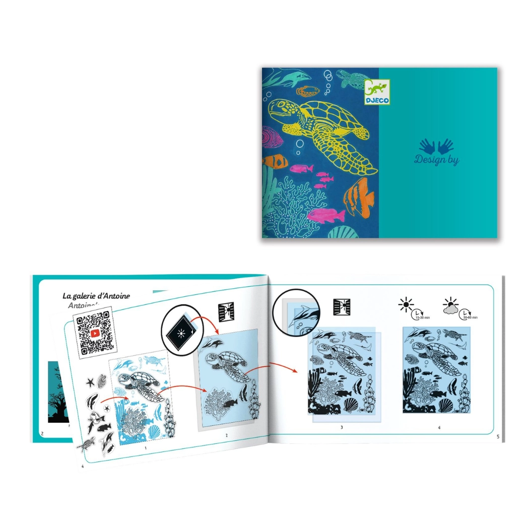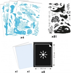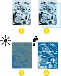 Descoperă farmecul fotografiei albastre cu setul creativ Djeco Lumea Subacvatică! Datorită tehnicii cianotipiei, copiii își vor crea propriile imagini originale cu motive ale vieții marine. Setul sprijină creativitatea, motricitatea fină și bucuria de a crea.