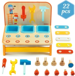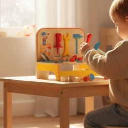 Copiii își exersează motricitatea fină și coordonarea prin strângerea șuruburilor, bătutul țărușilor și aranjarea pieselor. Ideal pentru primele deprinderi tehnice sub formă de joc.