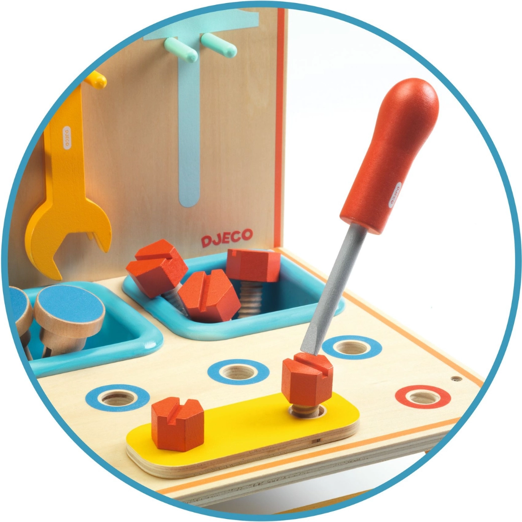 Acest atelier de lucru pentru copii din lemn, de înaltă calitate, îmbină distracția cu învățarea. Copiii pot înșuruba, ciocăni cu ciocanul, strânge cu cheia și cu șurubelnița, asambla piese colorate și antrena logica și răbdarea. Datorită dimensiunilor compacte, este potrivit pentru masă sau pentru camera copilului.