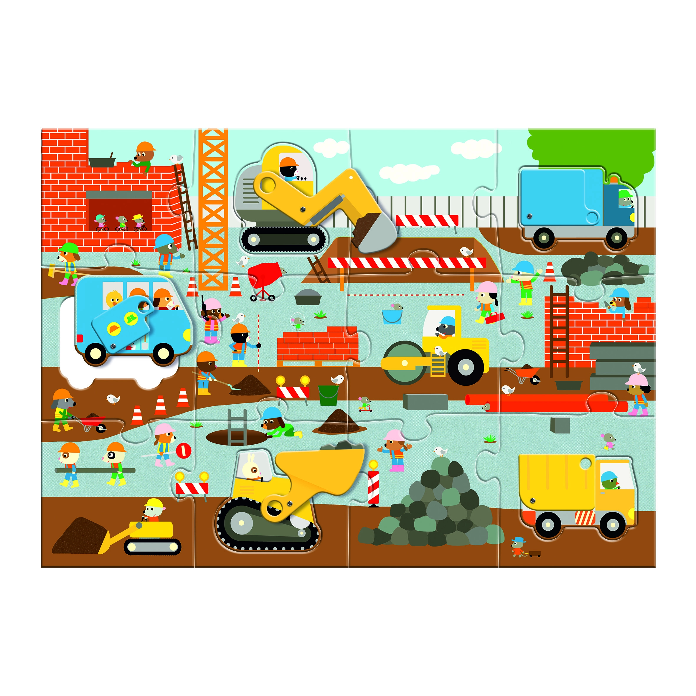 Puzzle-ul interactiv Construcție de la Djeco îmbină asamblarea și joaca într-un singur produs. După completarea imaginii, copiii pot „anima” scena șantierului datorită elementelor mobile de pe anumite piese – excavatorul încarcă pământul, camionul îl transportă și munca poate începe. Piesele mari și rezistente se prind ușor și sunt potrivite pentru mâinile mici ale copiilor.
