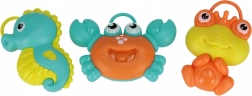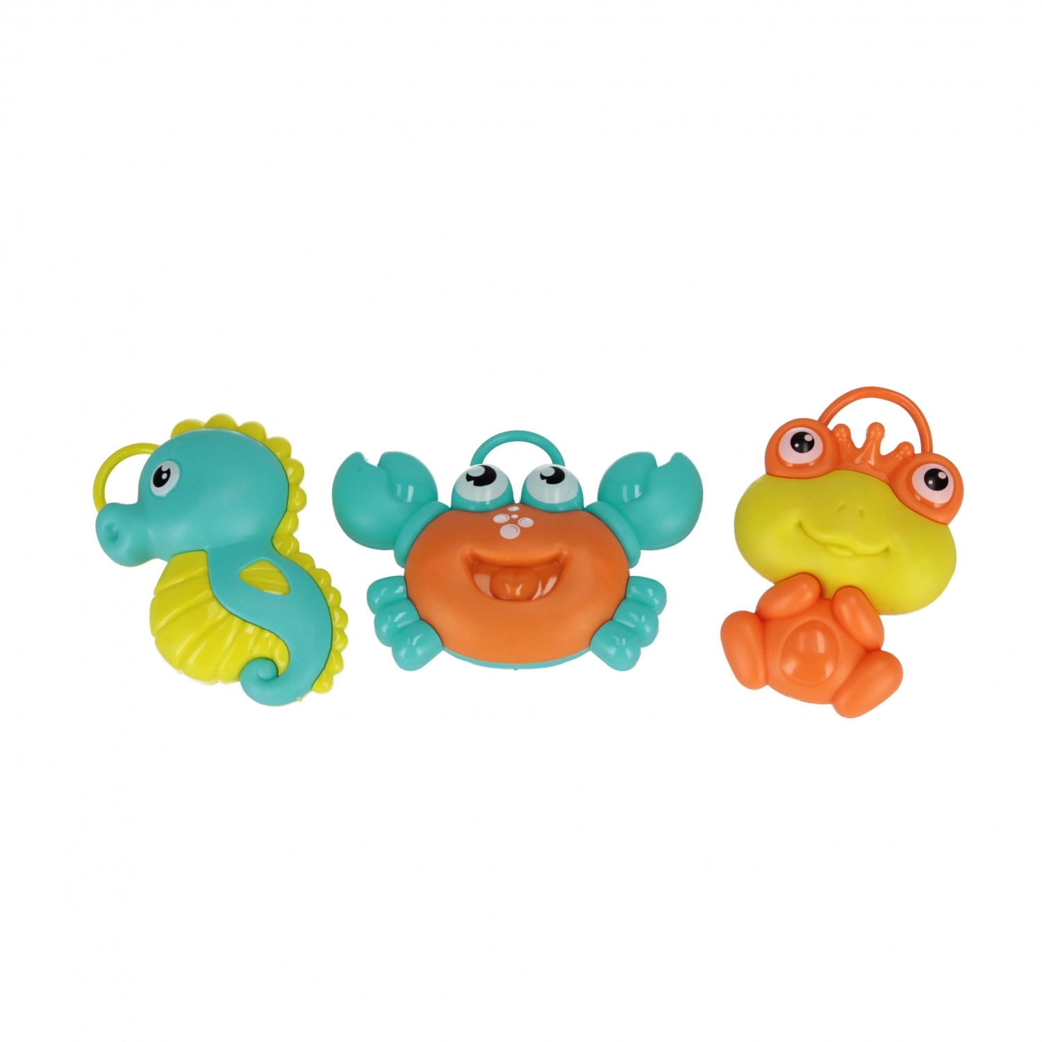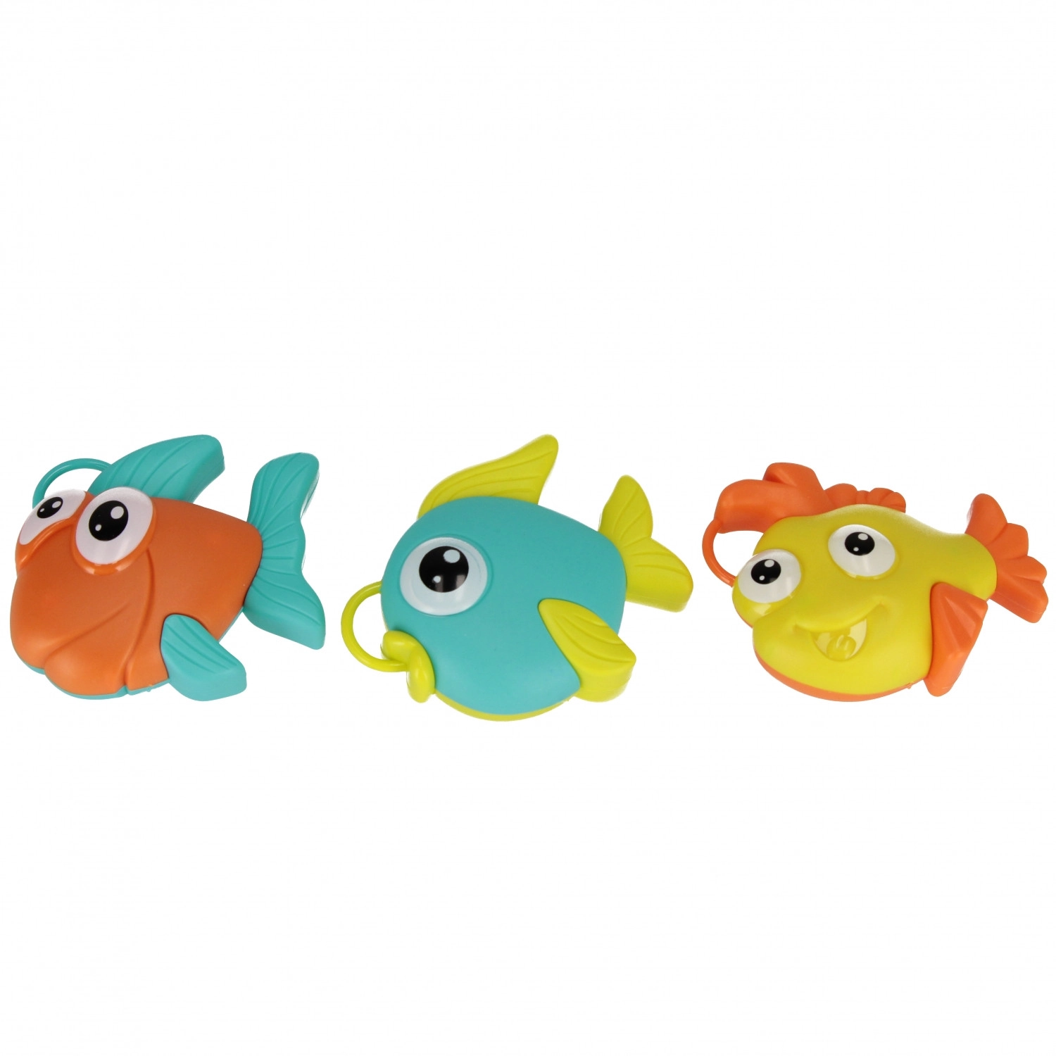 Trei peștișori adorabili, cu ochi mari, plutesc la suprafață, invită la joc și prelungesc distracția la baie.