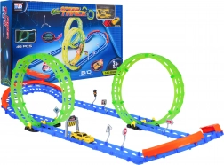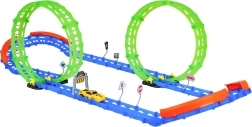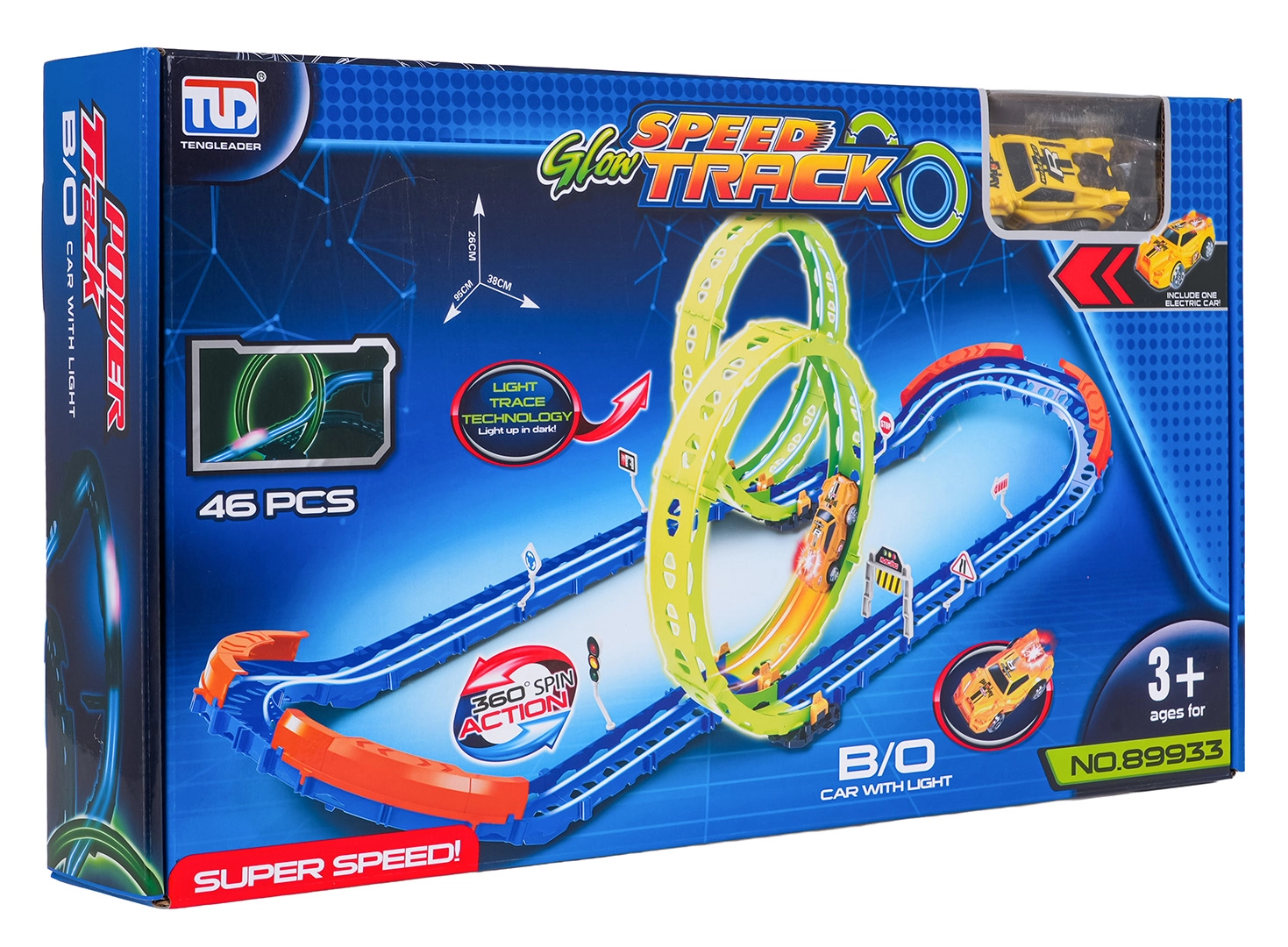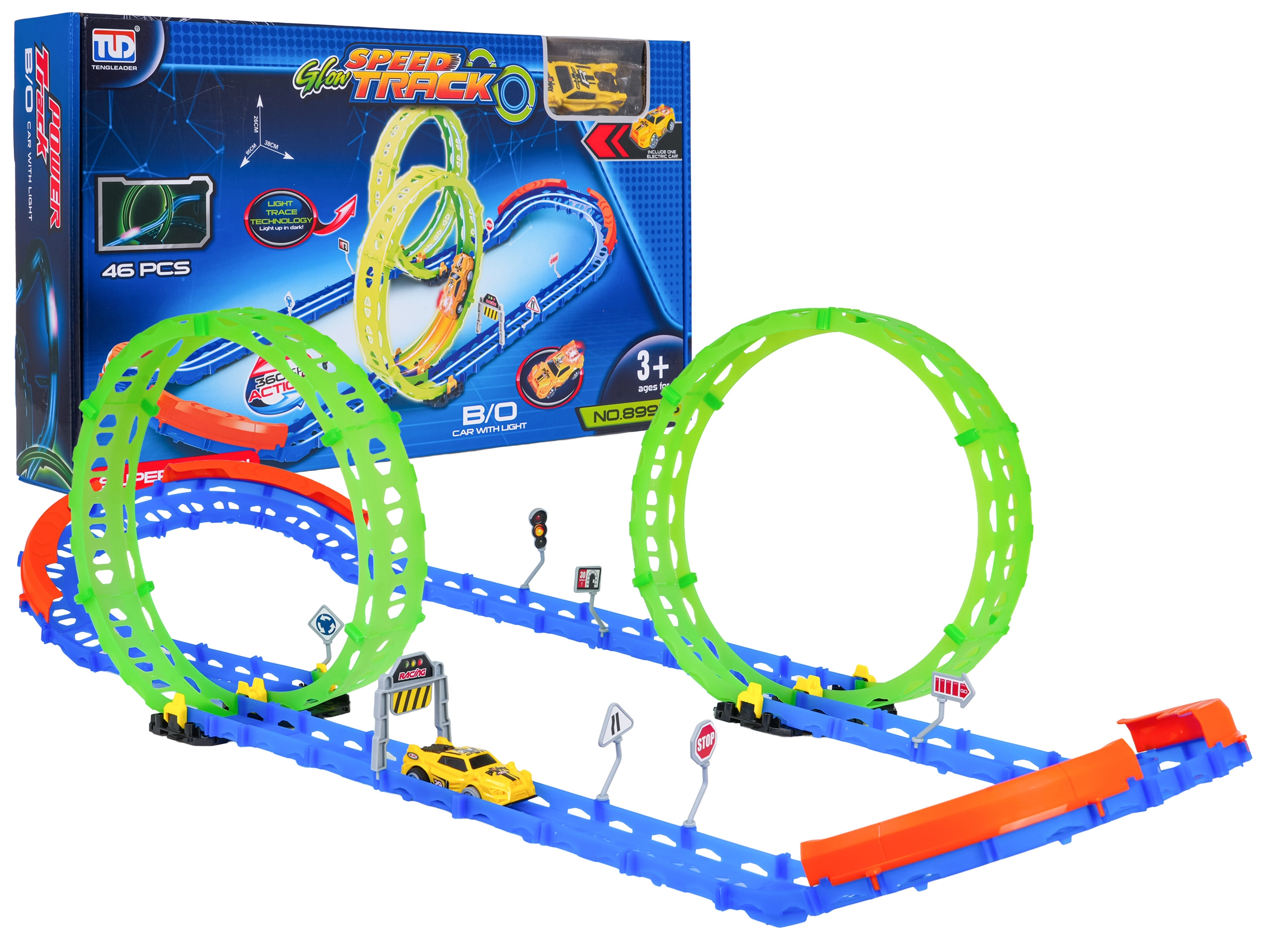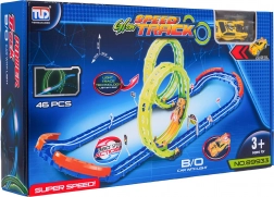 Această pistă de curse fluorescentă este ideală pentru copii de la 3 ani. Datorită celor două bucle mari și barierele laterale solide, mașinuța trece în siguranță chiar și prin virajele strânse. Elementele luminoase aprind cursa în semiîntuneric și transformă camera într-un mic circuit de curse.