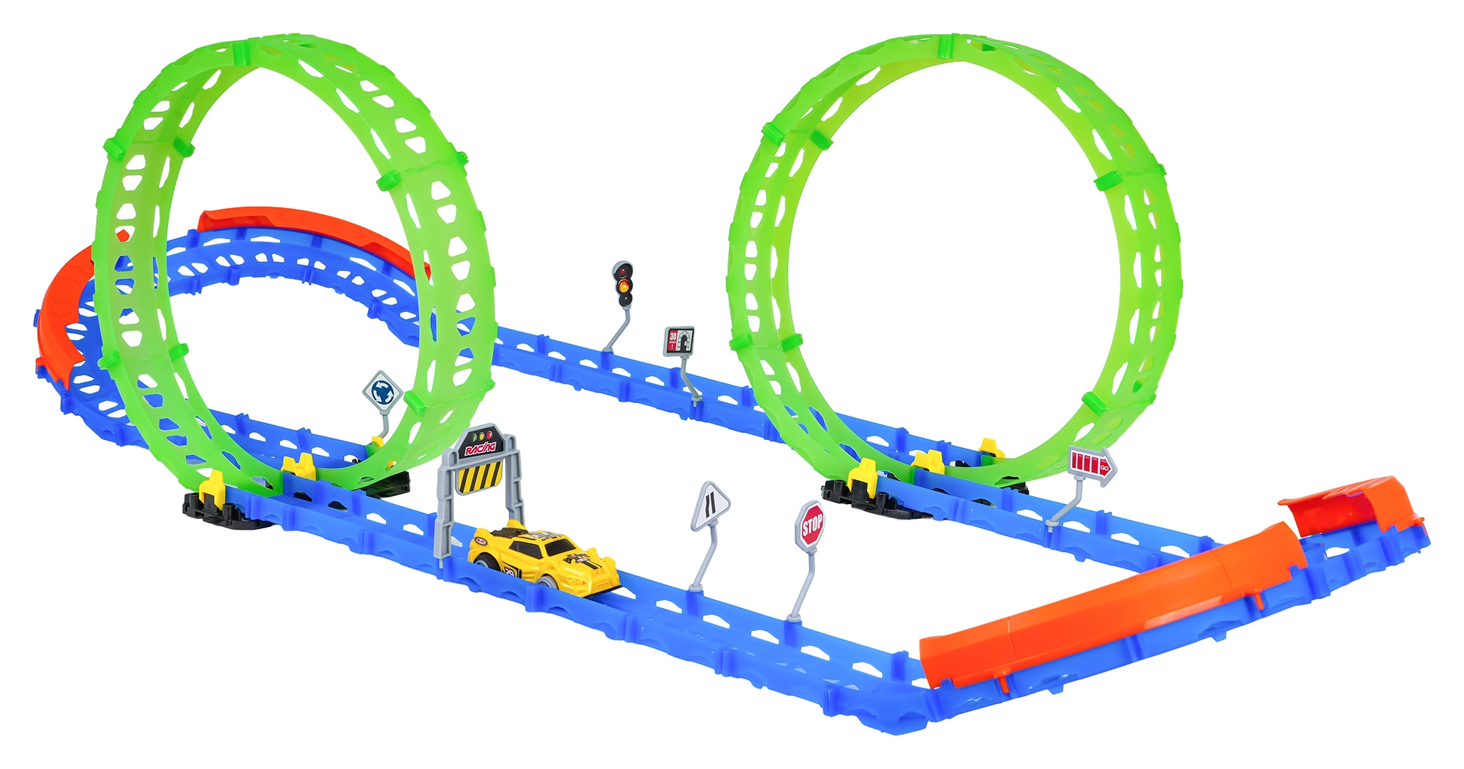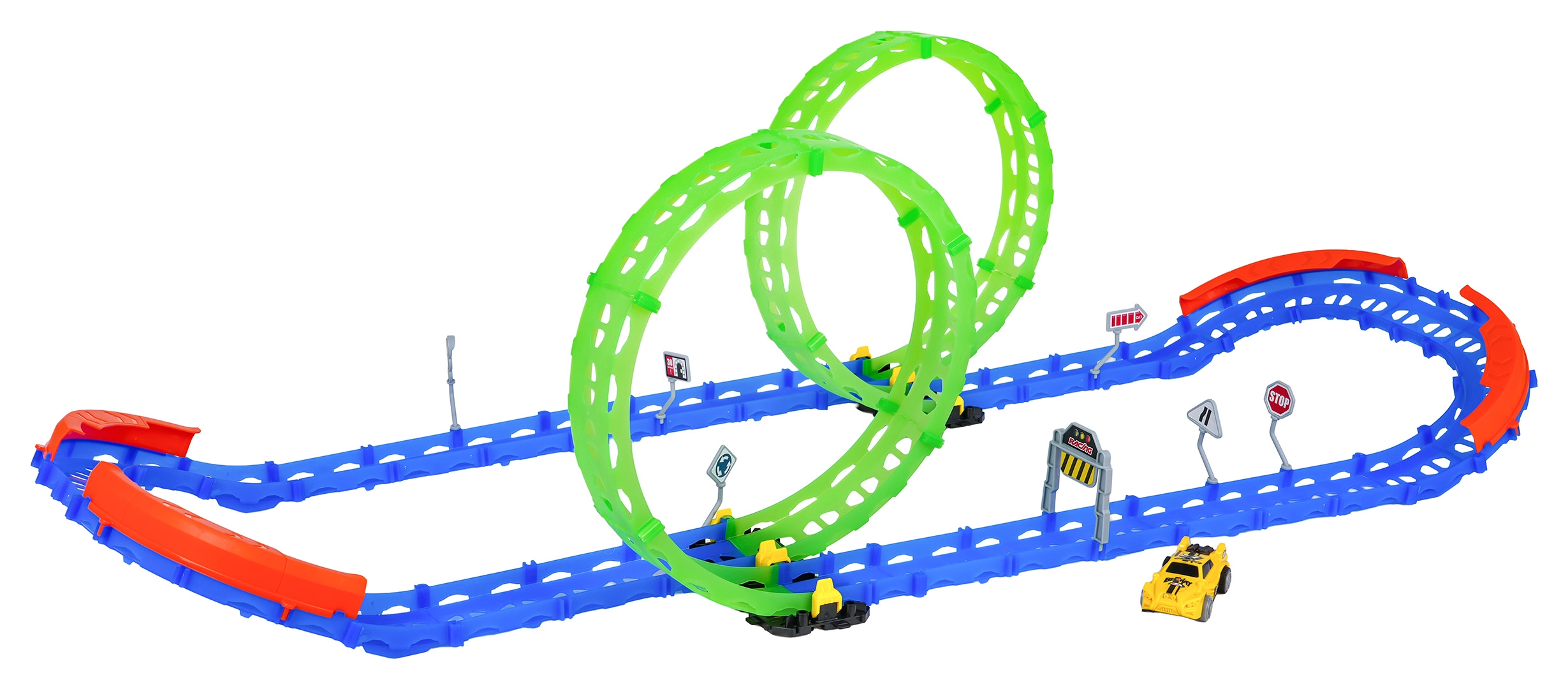 Setul conține 46 de piese pentru o asamblare ușoară, o mașinuță de curse galbenă cu lumină spate funcțională (alimentare 2× AAA, neincluse) și semnalizare rutieră pentru un joc și mai realist. Copiii pot reconfigura traseul de câte ori doresc și își pot doborî propriile recorduri.
