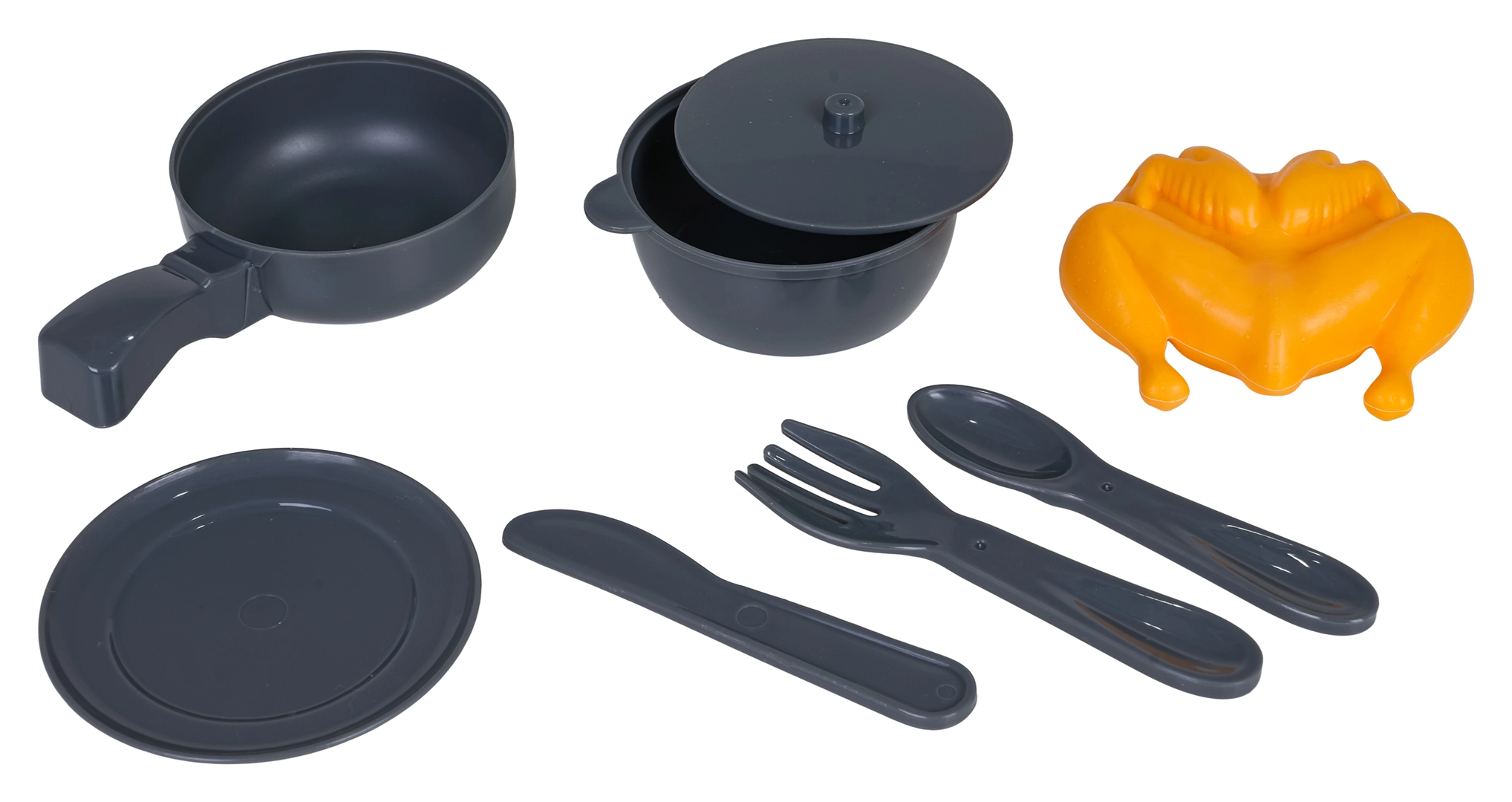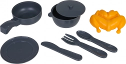 Include tigaie, oală cu capac, farfurioară, tacâmuri și un pui de jucărie – totul pentru rolul complet de mic bucătar.