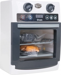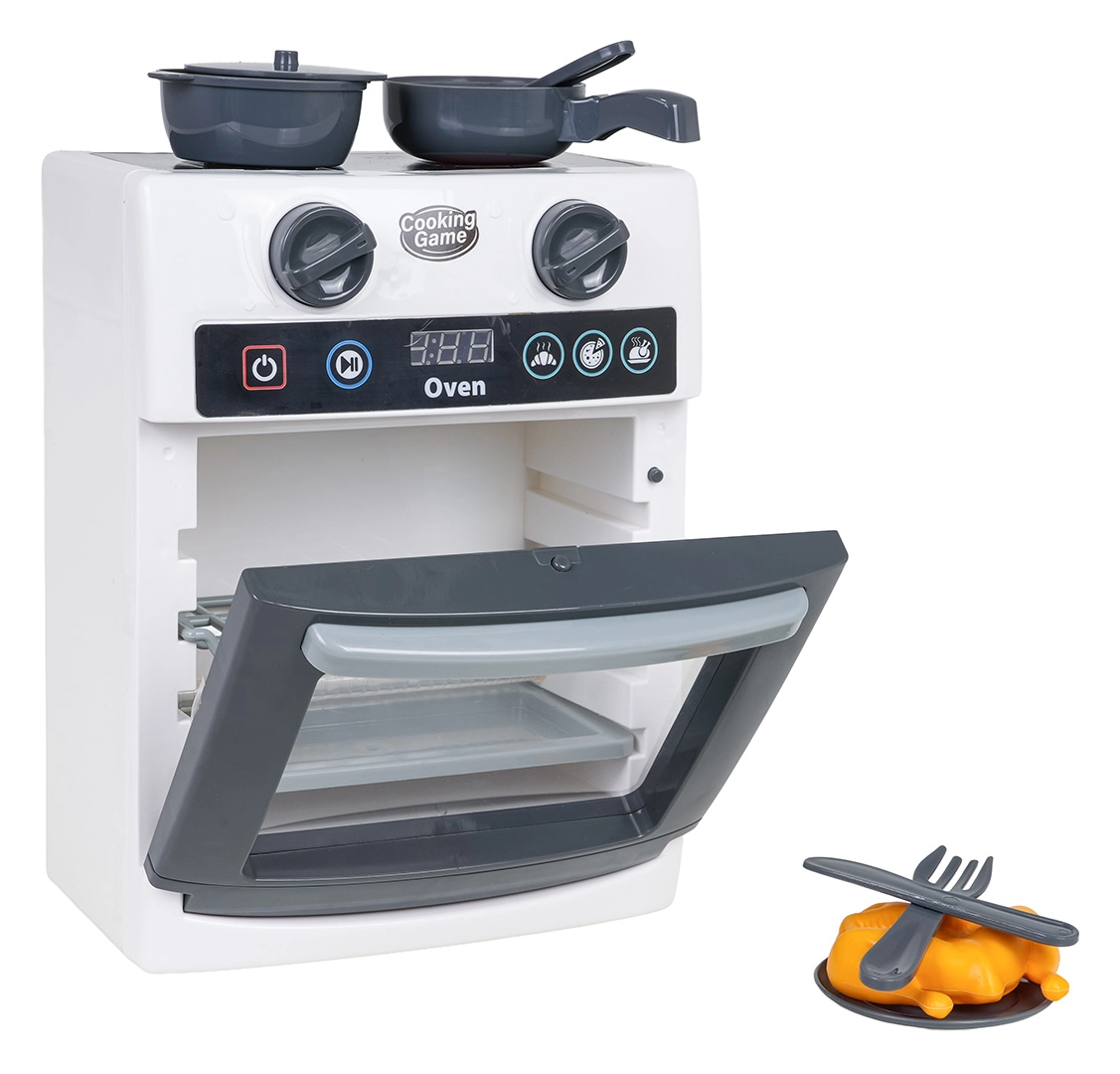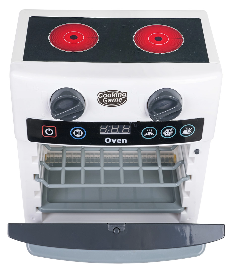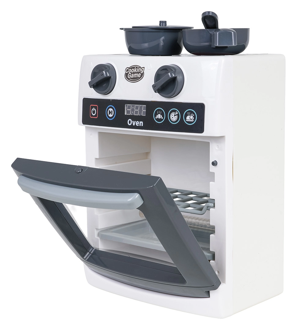 Acest cuptor pentru copii imită fidel un aparat real – are ușă transparentă, rotițe mobile de control și panou cu temporizator. În timpul coacerii se aprinde interiorul și se aud sunete realiste de deschidere/închidere a ușii, coacere și final de program. Jocul de-a bucătarul capătă astfel o nouă dimensiune de creativitate și fantezie.