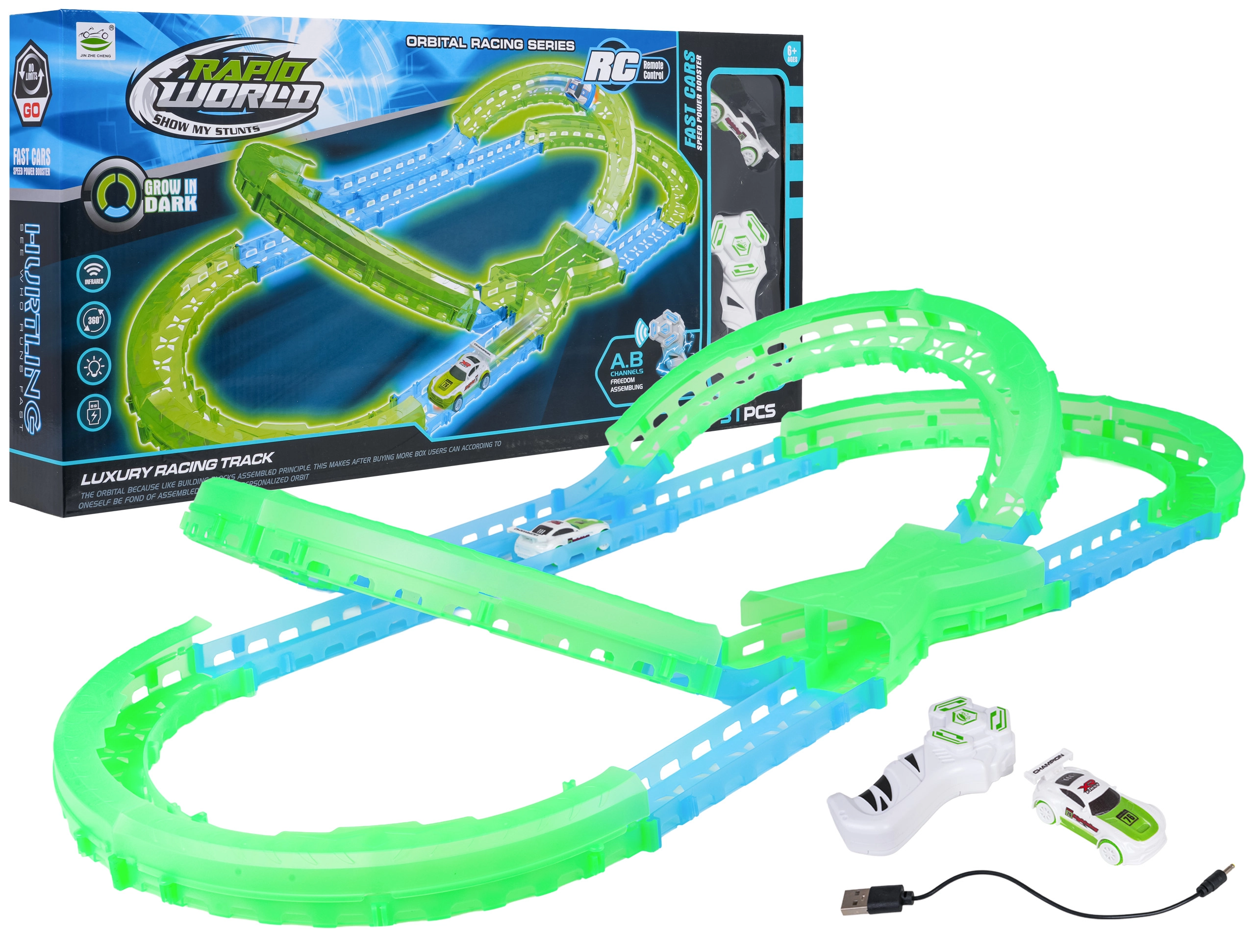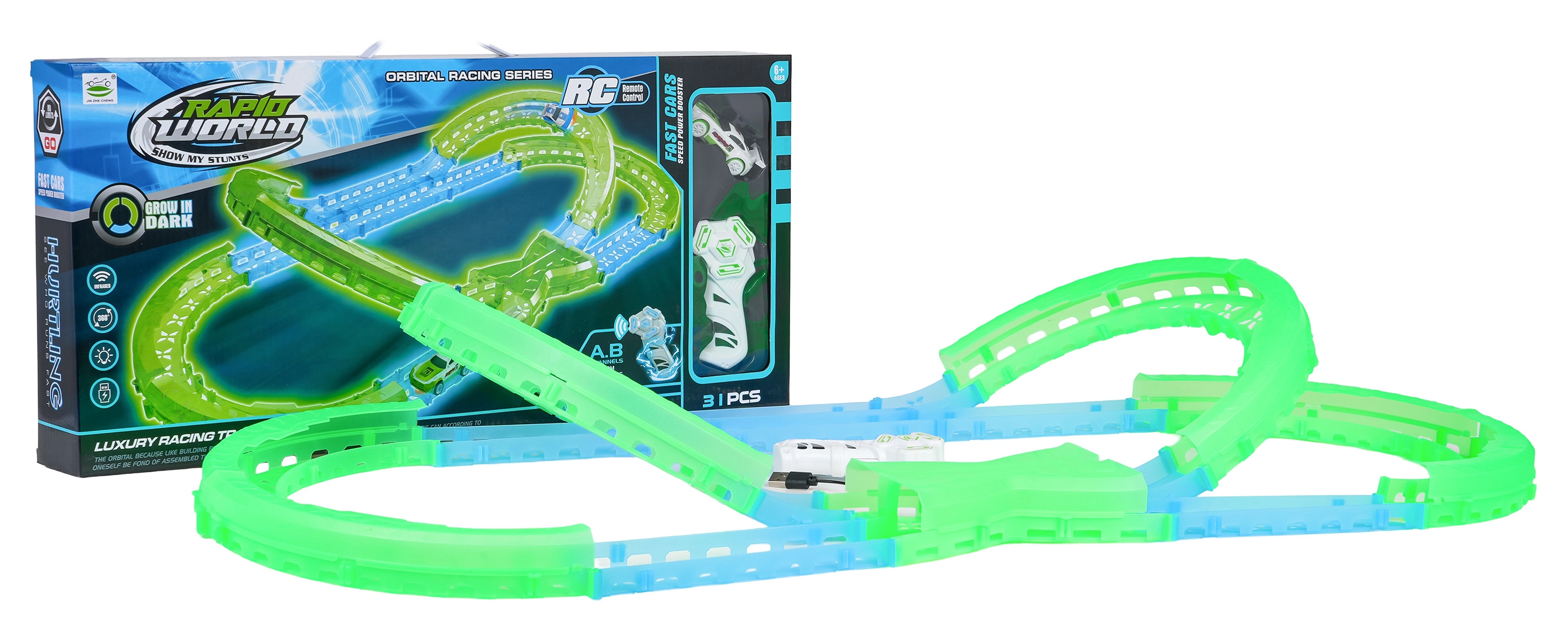 Descoperă distracția cu pista de curse luminoasă, care impresionează prin fluorescență și iluminarea LED spectaculoasă a mașinuței. Datorită telecomenzii, copiii se bucură de condus plin de acțiune, construcția stimulează creativitatea și motricitatea fină, iar întregul set oferă o priveliște captivantă în întuneric.