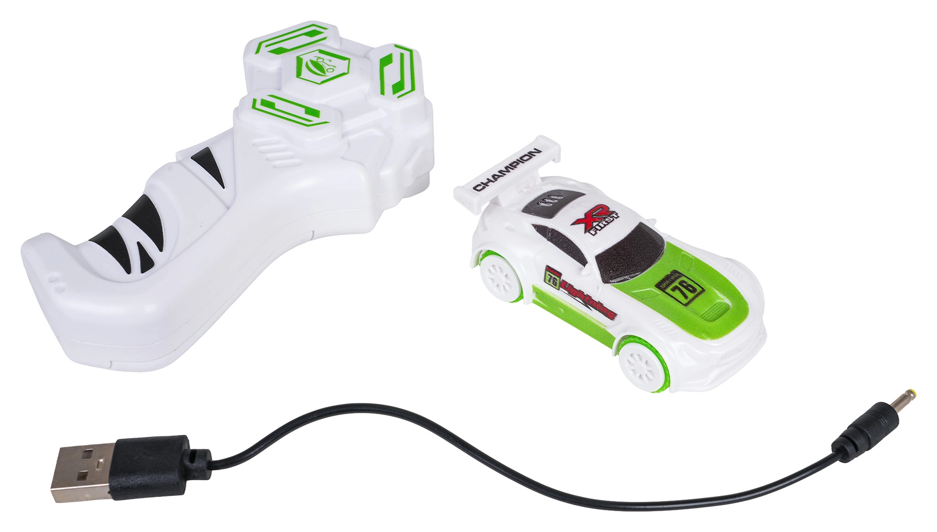 - Pistă și piese de construcție, mașinuță cu LED, telecomandă, cablu USB, instrucțiuni de asamblare