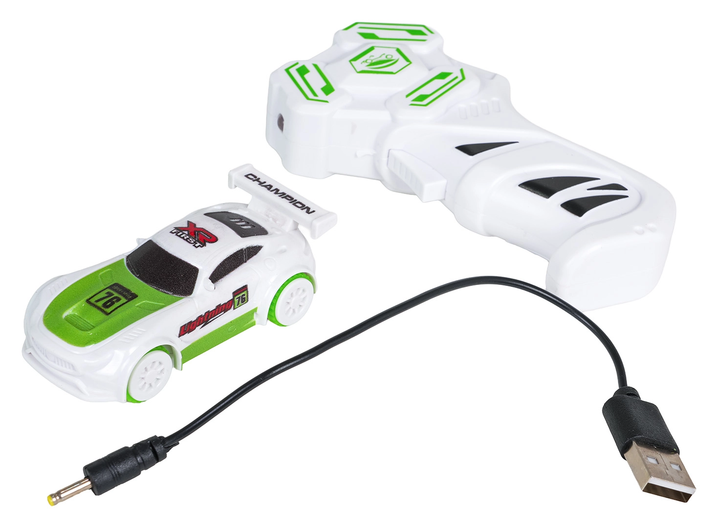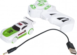 O mașinuță de curse compactă cu iluminare LED se controlează cu telecomanda inclusă. Încărcarea este asigurată prin cablul USB din pachet.