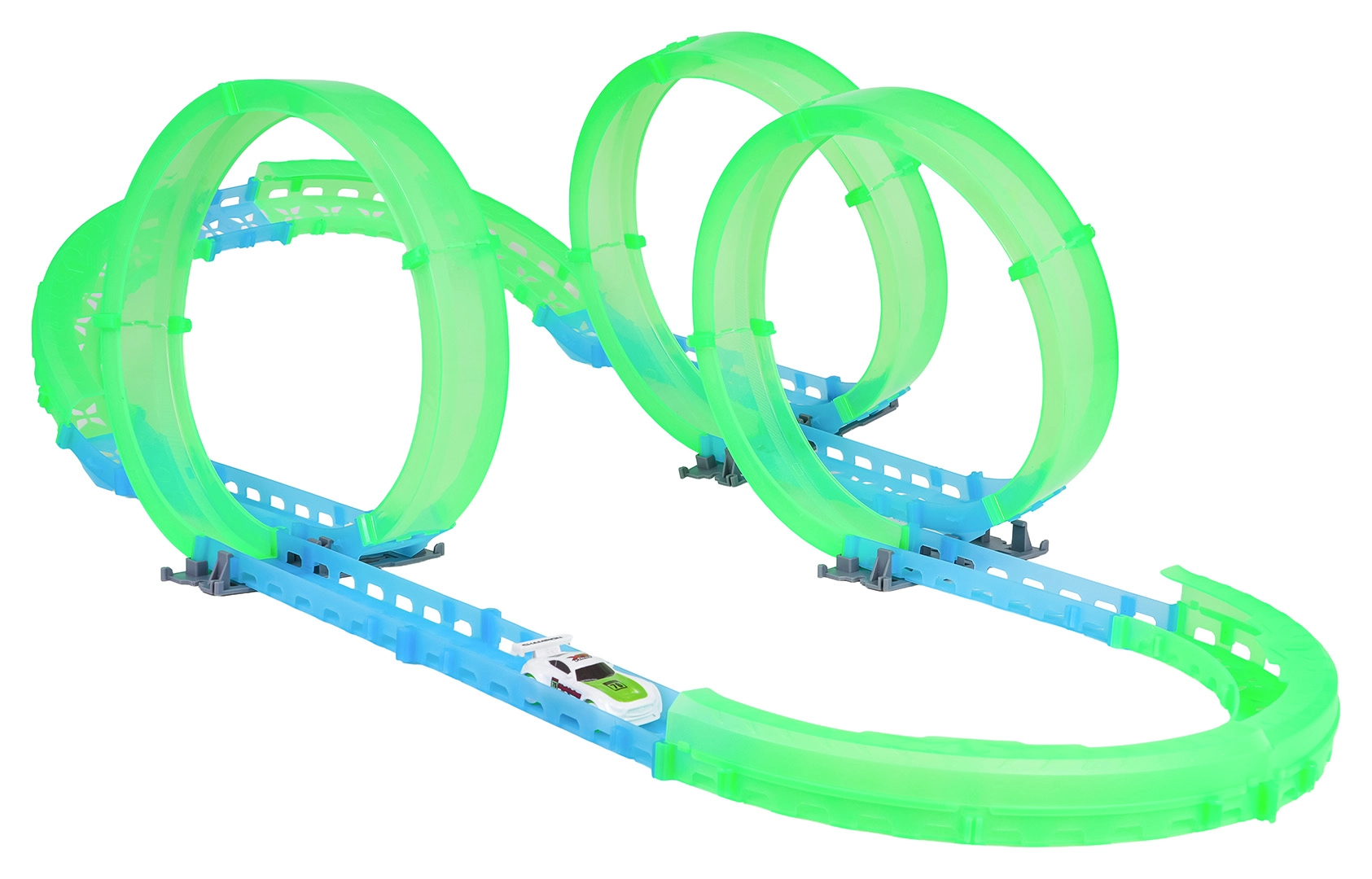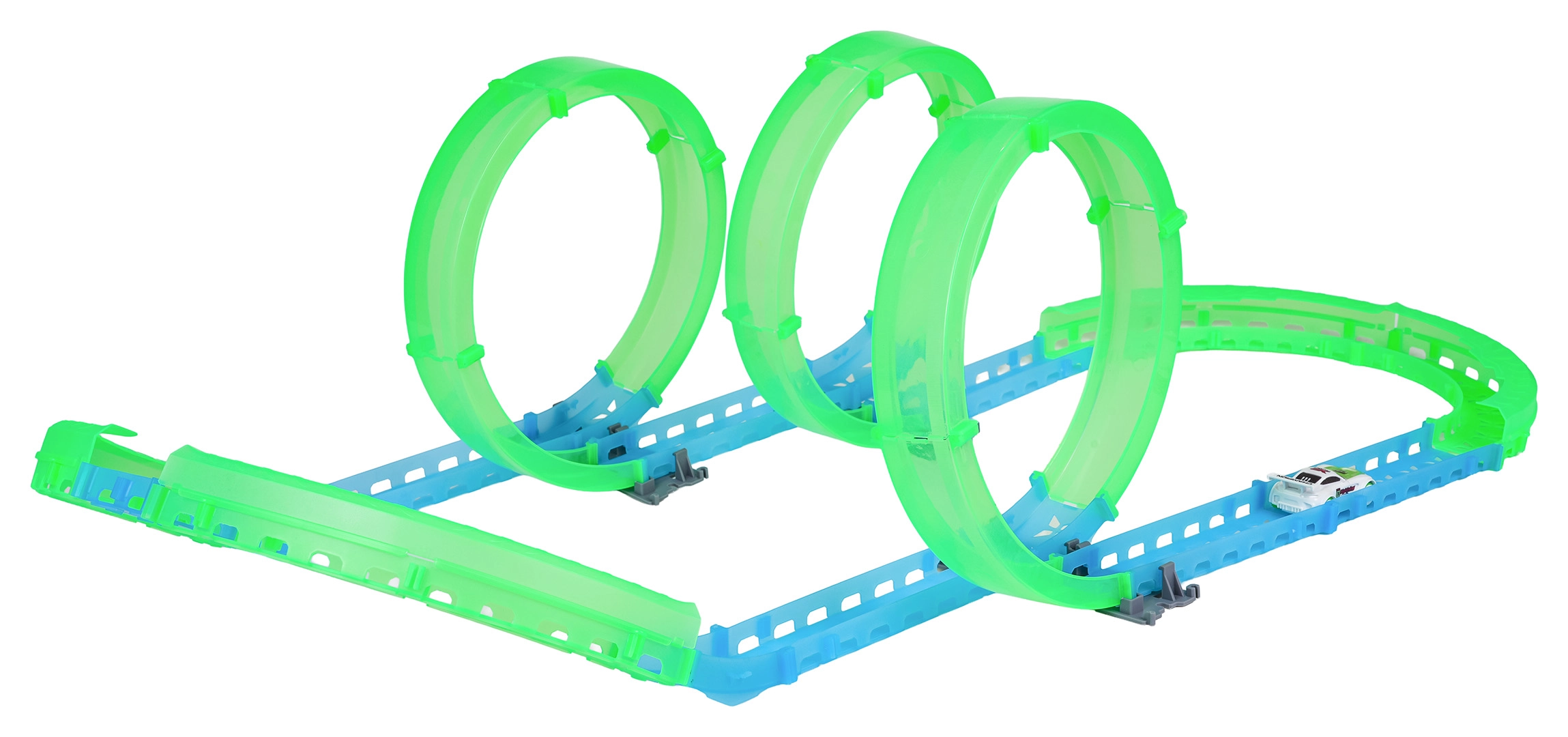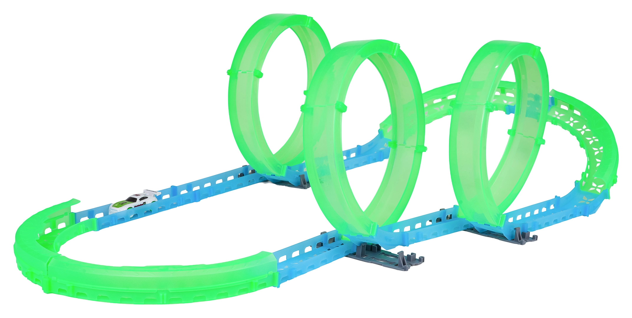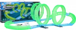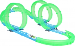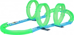 Pista fluorescentă se aprinde după expunere la lumină și creează o atmosferă magică de curse nocturne care îi va cuceri pe copii.