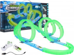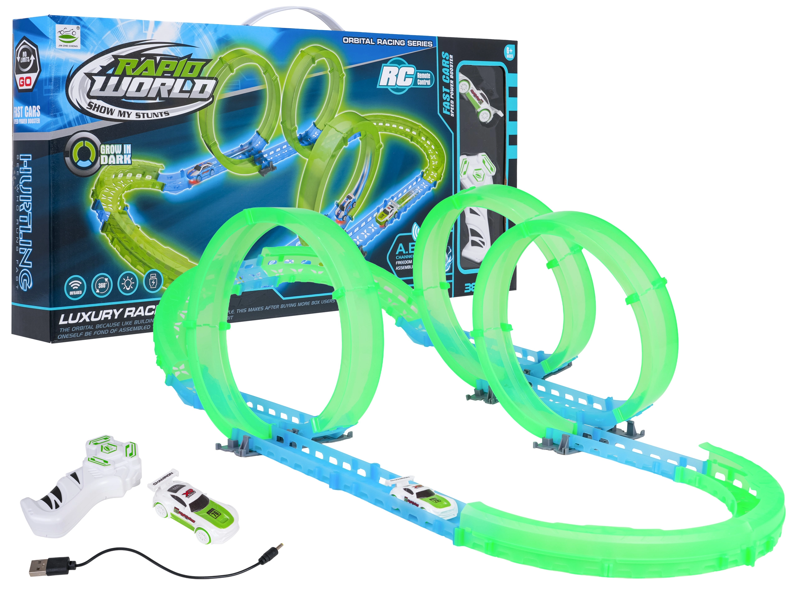Pistă de curse luminoasă pentru copii de la 6 ani oferă o cursă plină de acțiune cu o mașinuță RC cu iluminare LED. Pista fluorescentă strălucește în întuneric, mașinuța se încarcă prin USB, iar telecomanda funcționează cu baterii 2× AAA (neincluse). Asamblare simplă, efecte luminoase grozave și distracție care dezvoltă coordonarea și imaginația.