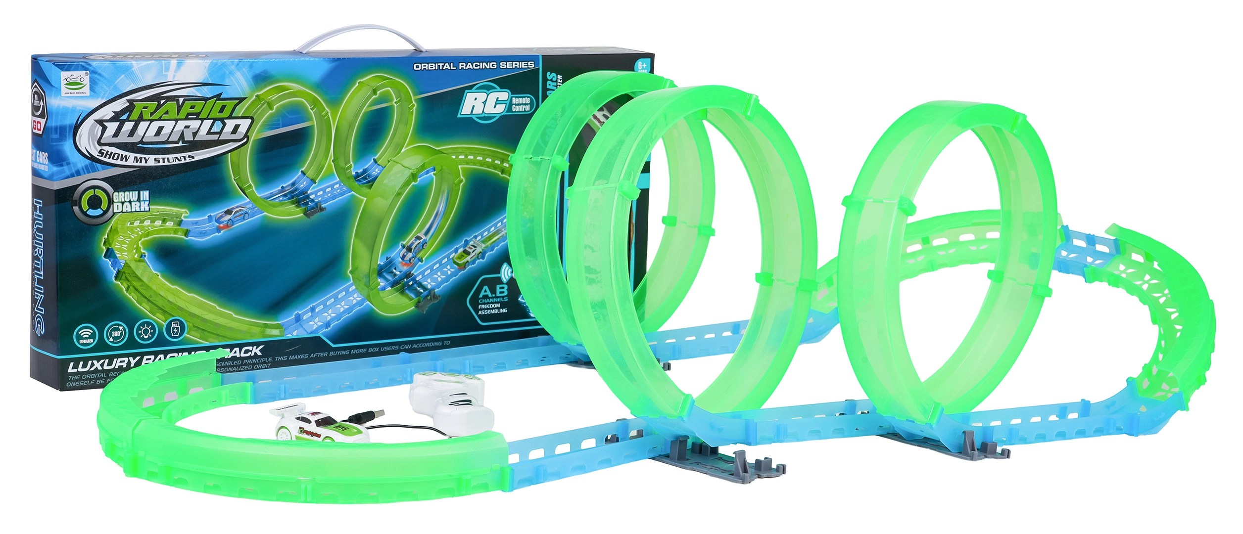 Construiește-ți propria pistă pentru cascadorii și bucură-te de curse chiar și după lăsarea serii. Elementele fluorescente strălucesc în întuneric, iar micuța mașinuță RC rulează înainte pe pista pregătită. Datorită iluminării LED, creează în timpul cursei efecte luminoase spectaculoase.