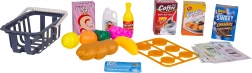 Include coș de cumpărături, machete de alimente, bancnote și monede euro, precum și card de plată – totul pentru o joacă completă de cumpărături.