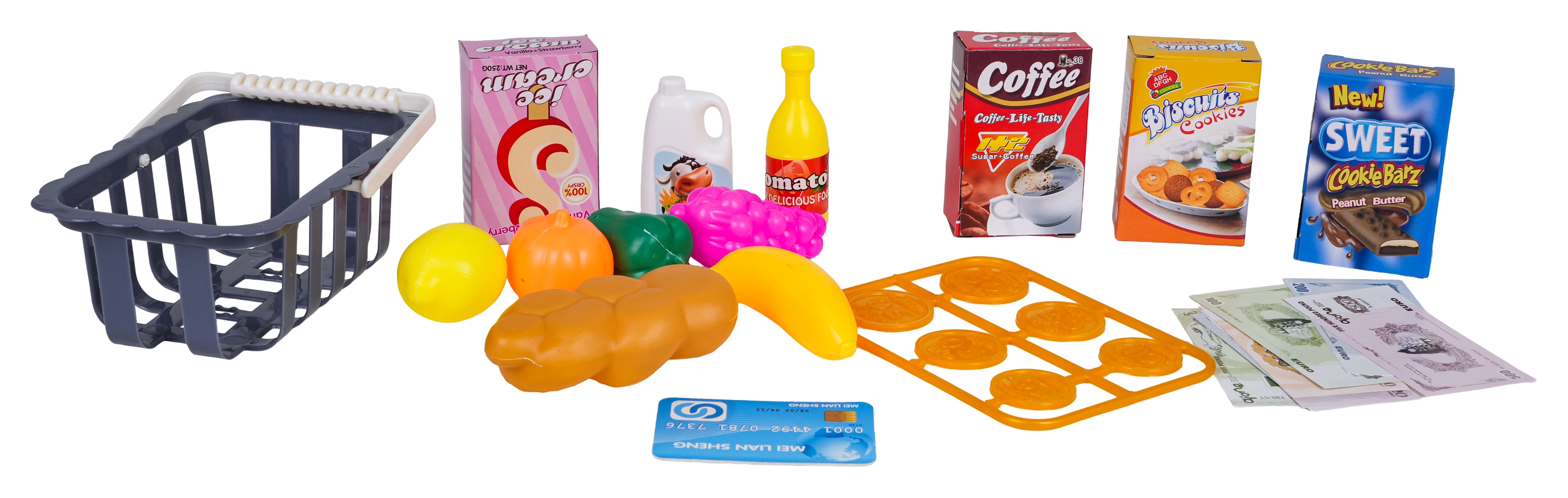 Setul conține până la 29 de piese, inclusiv bancnote și monede euro, card de plată și diverse machete de alimente (fructe, produse de panificație, băuturi și cutiuțe mici). Un set distractiv și sigur pentru ore îndelungate de jocuri de rol.