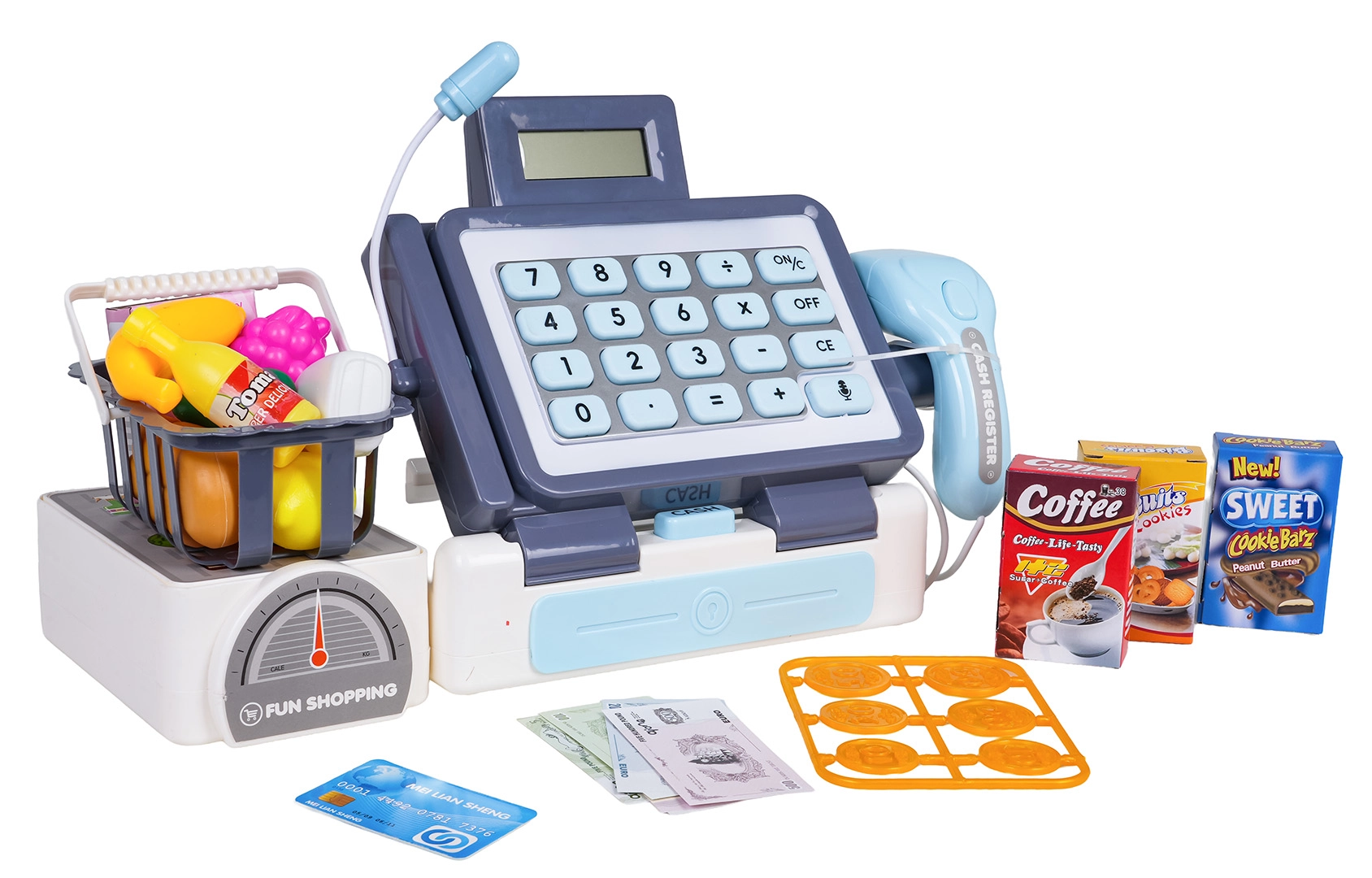 Calculatoarea funcțională, sertarul cu deschidere și microfonul adaugă elemente realiste jocului de-a magazinul și susțin învățarea calculelor și a comunicării.