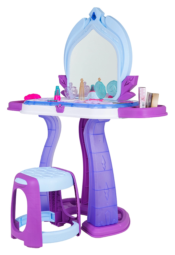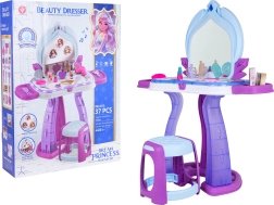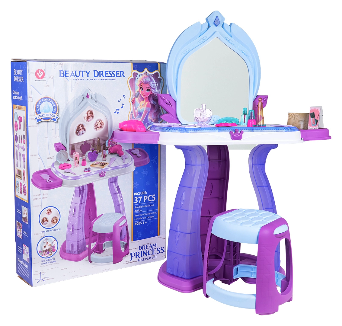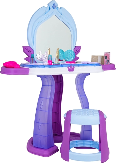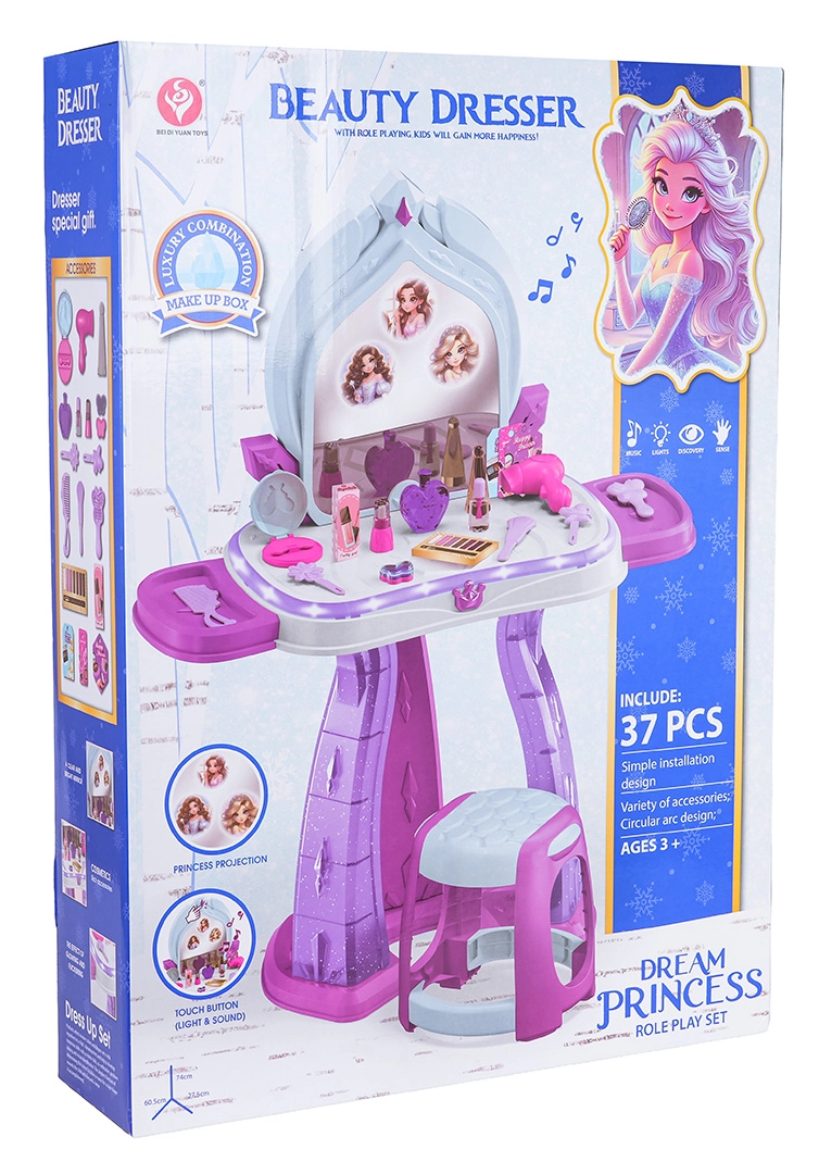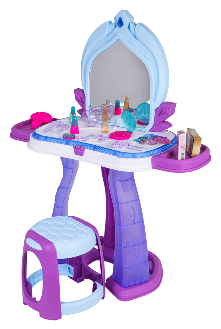 Această măsuță de toaletă pentru copii îmbină o construcție sigură cu distracție interactivă. În jurul blatului luminează o iluminare discretă, iar pe oglindă apar imagini cu prințese, însoțite de melodii vesele. Datorită accesoriilor bogate, copiii pot exersa jocuri de rol de machiaj, coafat și îngrijire a aspectului.