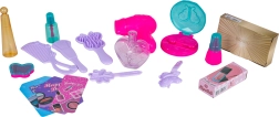 Până la 37 de accesorii: uscător de păr pentru copii, pieptănaș, perie, agrafe, pensulă, ruj, lac de unghii, „parfumuri”, farduri și alte machete de cosmetice.