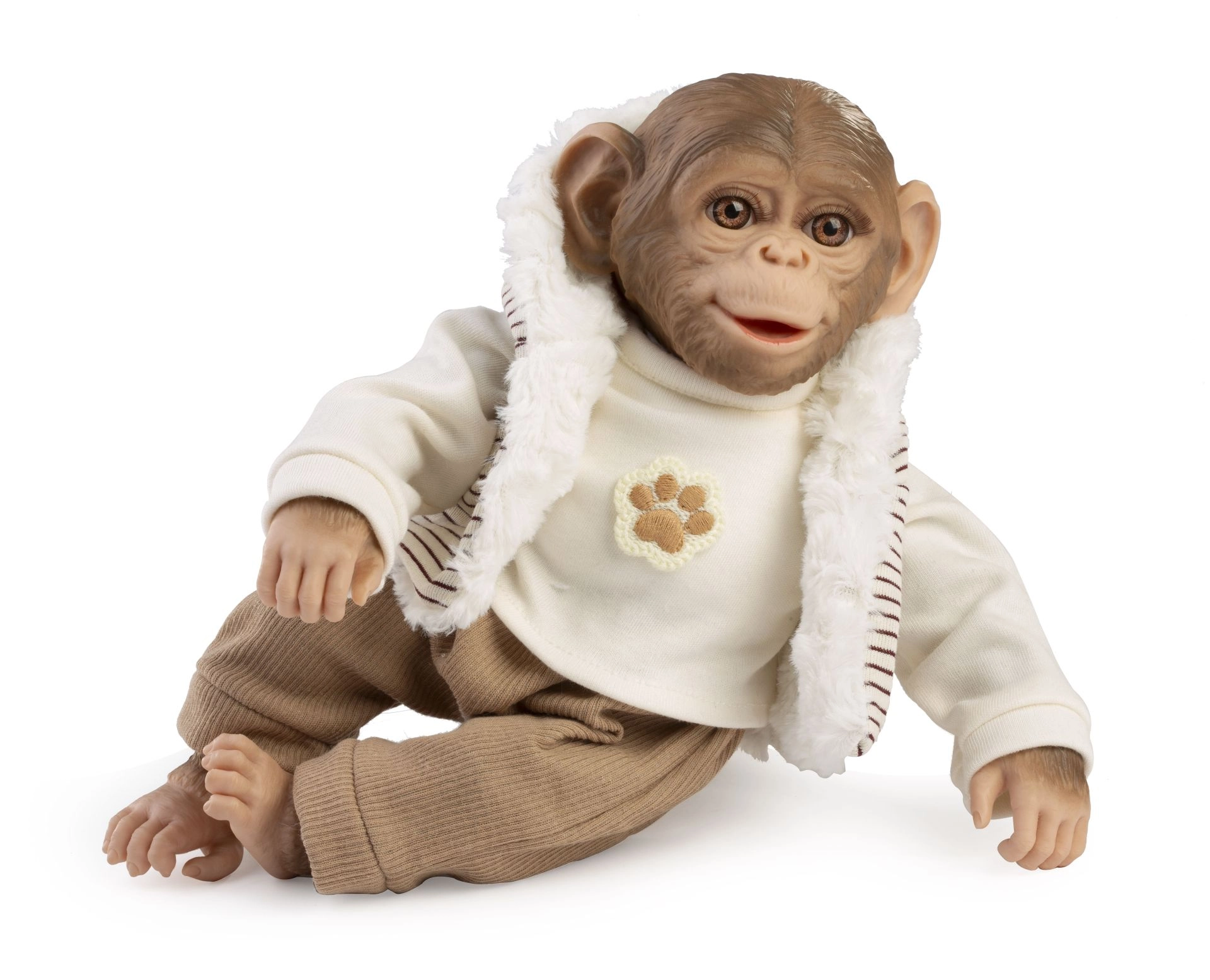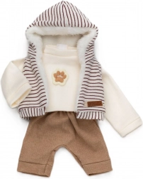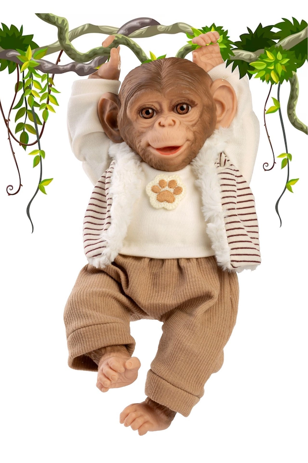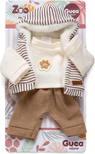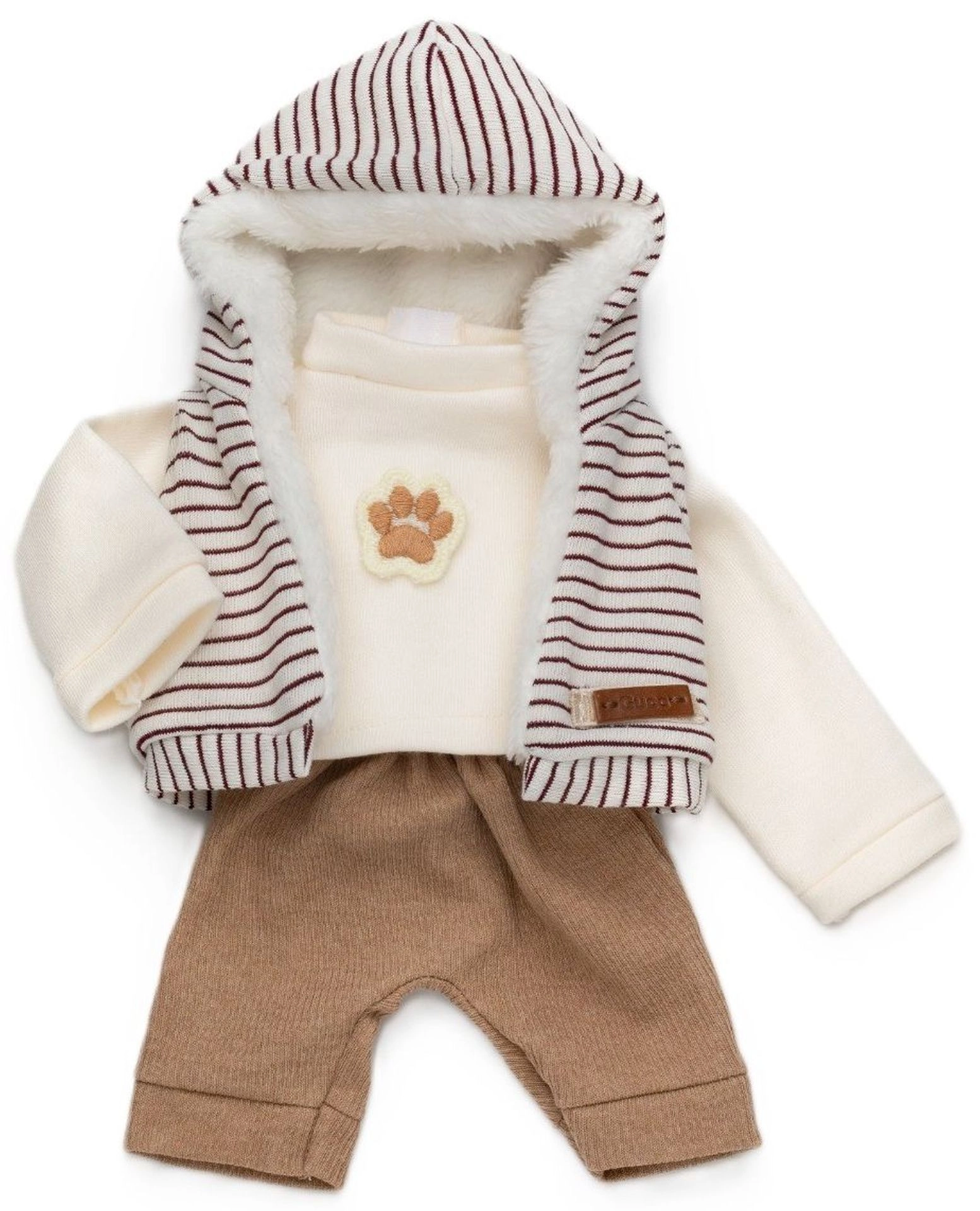 Acest set stilat pentru maimuțica Reborn 32 cm include trei piese asortate – tricou crem cu mânecă lungă și motiv lăbuță, vestă cu glugă în dungi cu blăniță călduroasă și pantaloni comozi. Ținuta este concepută pentru îmbrăcare și dezbrăcare ușoară, astfel încât copiii să poată schimba rapid look-ul jucăriei preferate.