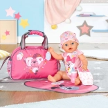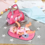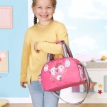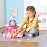 Geanta include o salteluță pentru schimbat, un scutec de rezervă și o cutie pentru pudră – copiii au la îndemână un kit complet pentru îngrijirea păpușii.