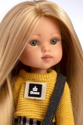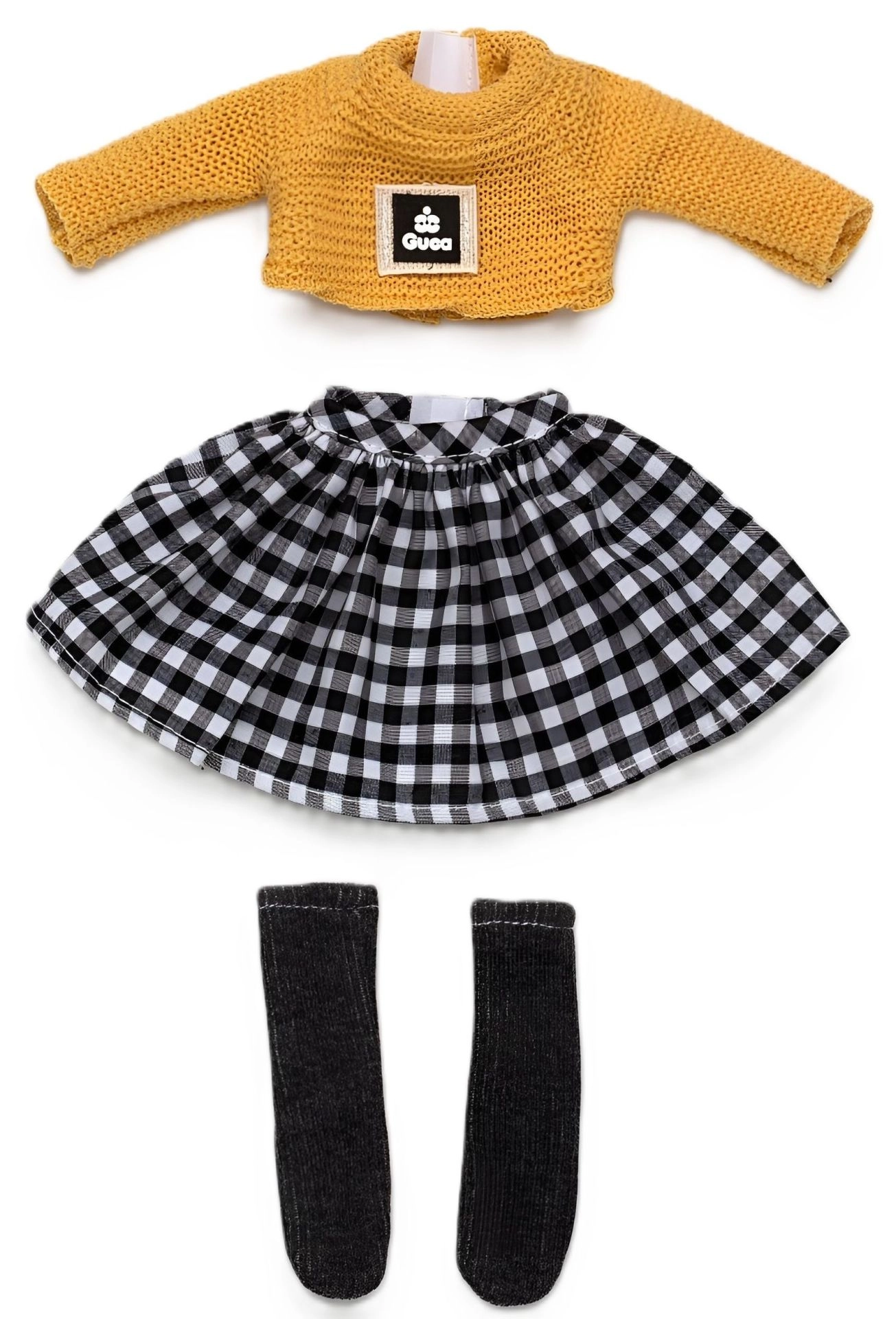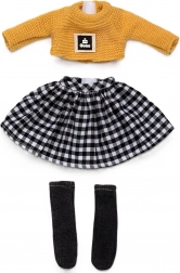 Set stilat de hăinuțe pentru păpușa Penelope 34 cmmanufactură manuală din Spania, textile de calitate și îmbrăcare ușoară. Conține pulover tricotat galben, fustă alb-negru în carouri și șosete până la genunchi închise la culoare, ideal pentru joacă și styling creative. Potrivit de la 3 ani.