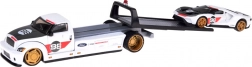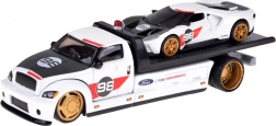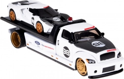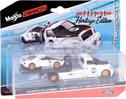 Setul Maisto aduce o experiență autentică din lumea motorsportului, în format de buzunar. Camionul platformă, cu rampă funcțională, transportă modelul realizat cu precizie FORD GT Heritage 2021, cu linii fidele ale caroseriei și numărul de concurs 98. Combinația de alb cu detalii contrastante și jante aurii subliniază aspectul premium.