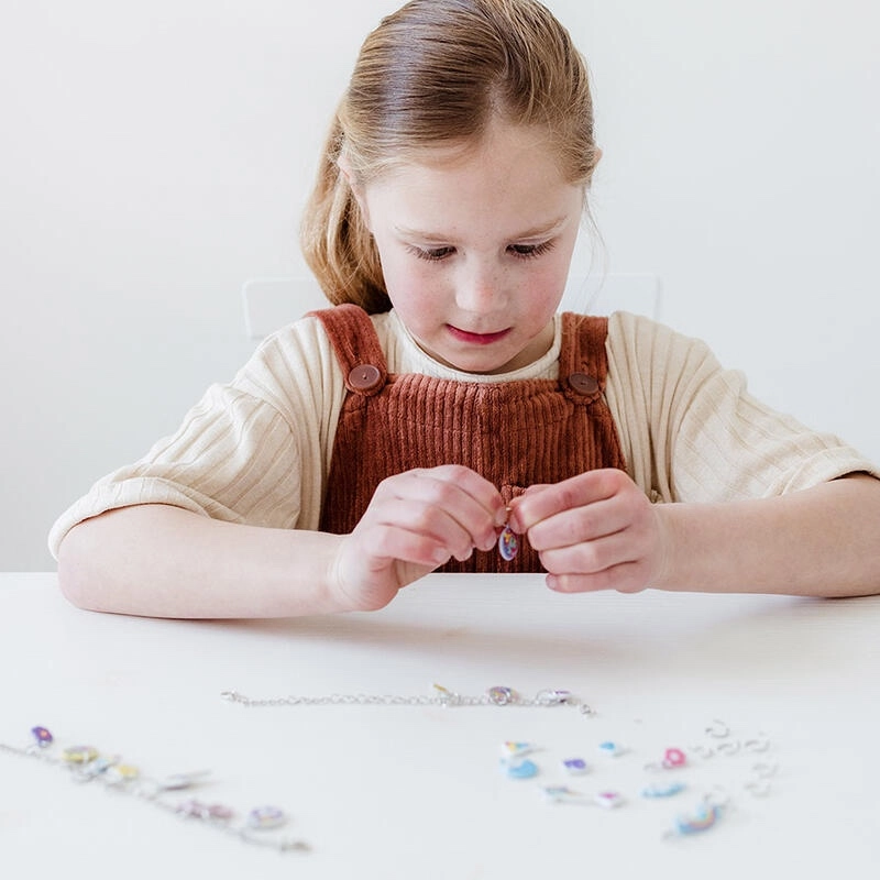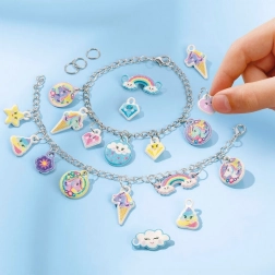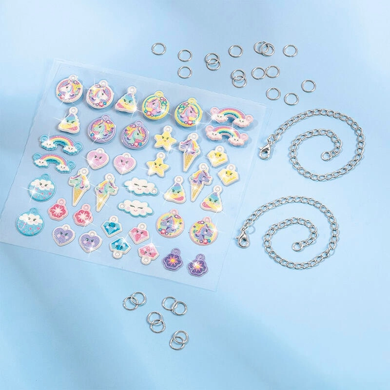 Descoperă bucuria bijuteriilor DIY! Acest set creativ îți permite să proiectezi și să realizezi cu ușurință brățări originale cu autocolante puffy minunate și detalii strălucitoare. Ideal ca dar pentru micii creatori care iubesc unicornii și accesoriile sclipitoare.