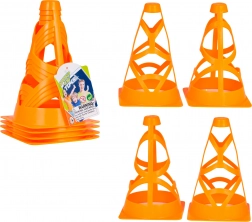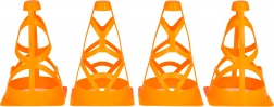 Set de patru conuri portocalii pentru copii de la 3 ani și sportivi adulți. Sunt ușoare, stivuibile și, datorită culorii portocalii intense, foarte vizibile. Construcția deschisă cu găuri pentru ancorare asigură stabilitate chiar și pe vânt. Potrivite pentru antrenamente de fotbal, exerciții de agilitate și delimitarea zonelor pe teren sau în curte.